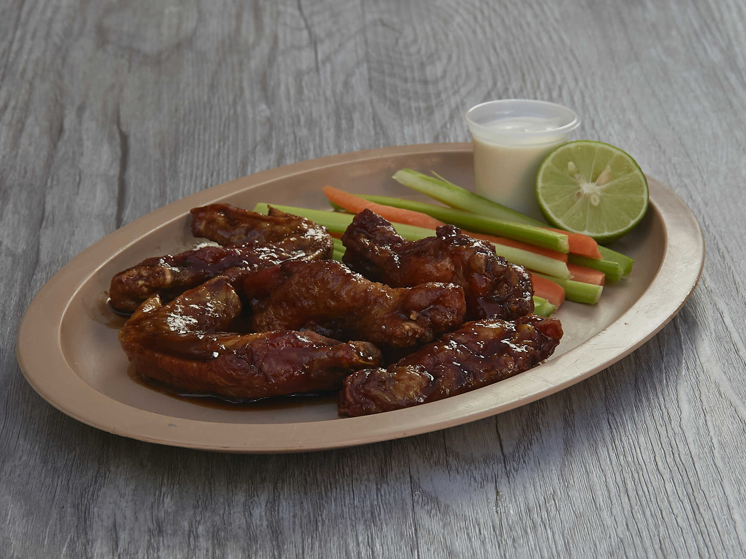 4 alitas, 125 gr de boneless bañados en tu aderezo preferido, 125 gr de papas a a francesa, acompañado de bastoncitos de apio, zanahoria yaderezo ranch