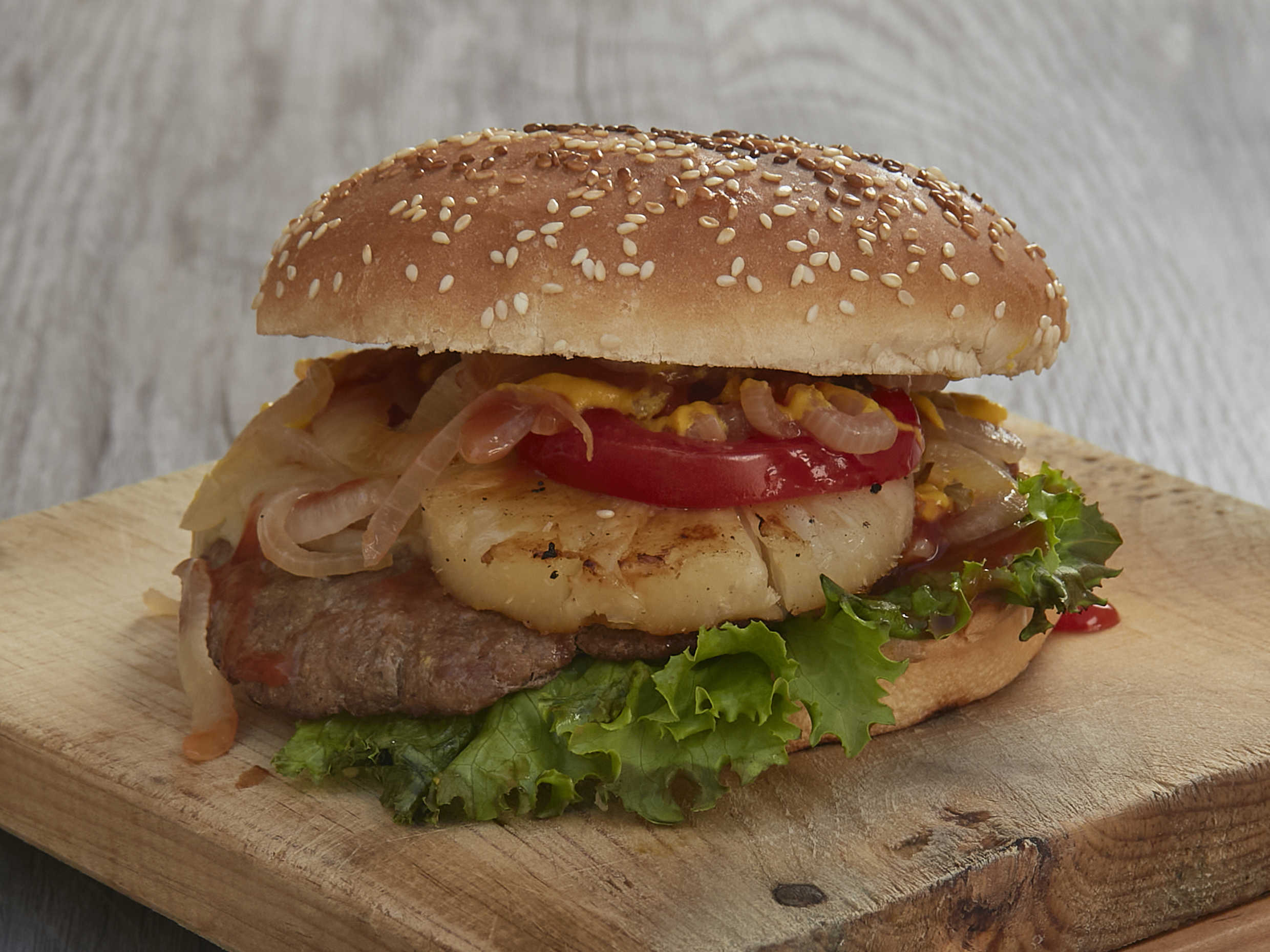 Jugosa Carne 100% de res (Receta de la casa) Gratinada con queso gouda y piña asada. *Todas nuestras hamburguesas son al carbón y preparadas con bimbollo jumbo, lechuga italiana, jitomate, cebolla caramelizada, rajas, mayonesa, catsup y mostaza*