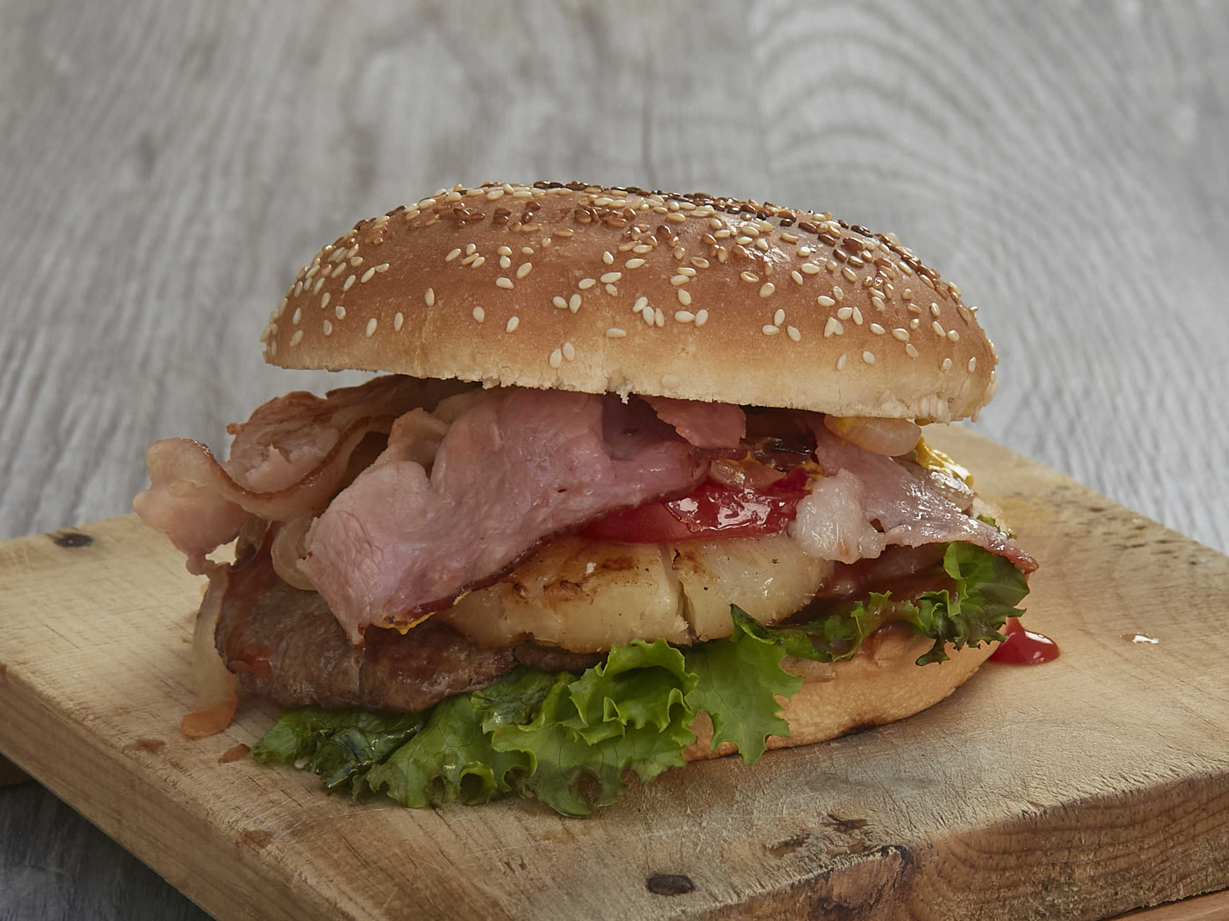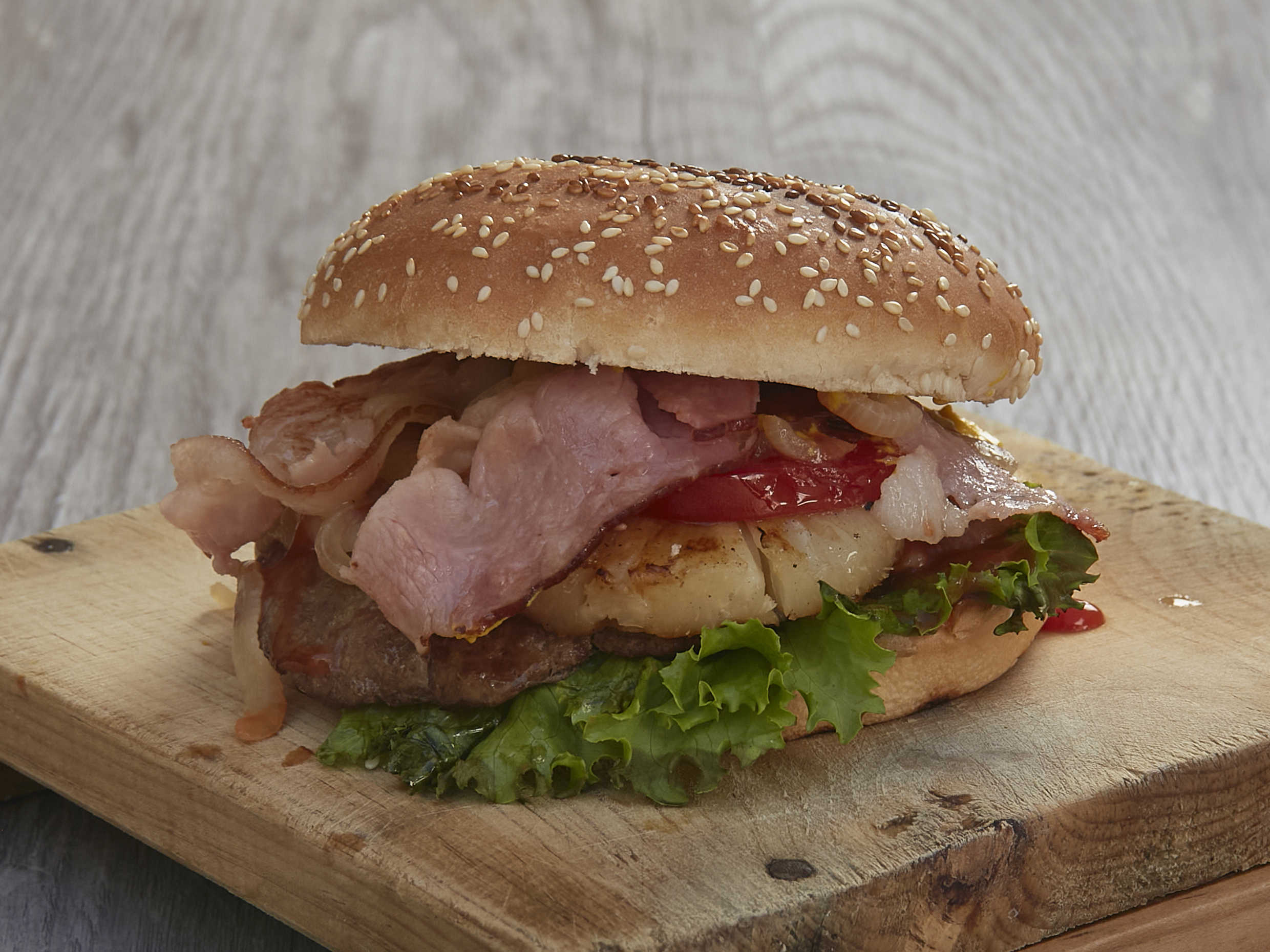 Jugosa Carne 100% de res (Receta de la casa) Gratinada con queso gouda, piña asada y tocino. *Todas nuestras hamburguesas son al carbón y preparadas con bimbollo jumbo, lechuga italiana, jitomate, cebolla caramelizada, rajas, mayonesa, catsup y mostaza*