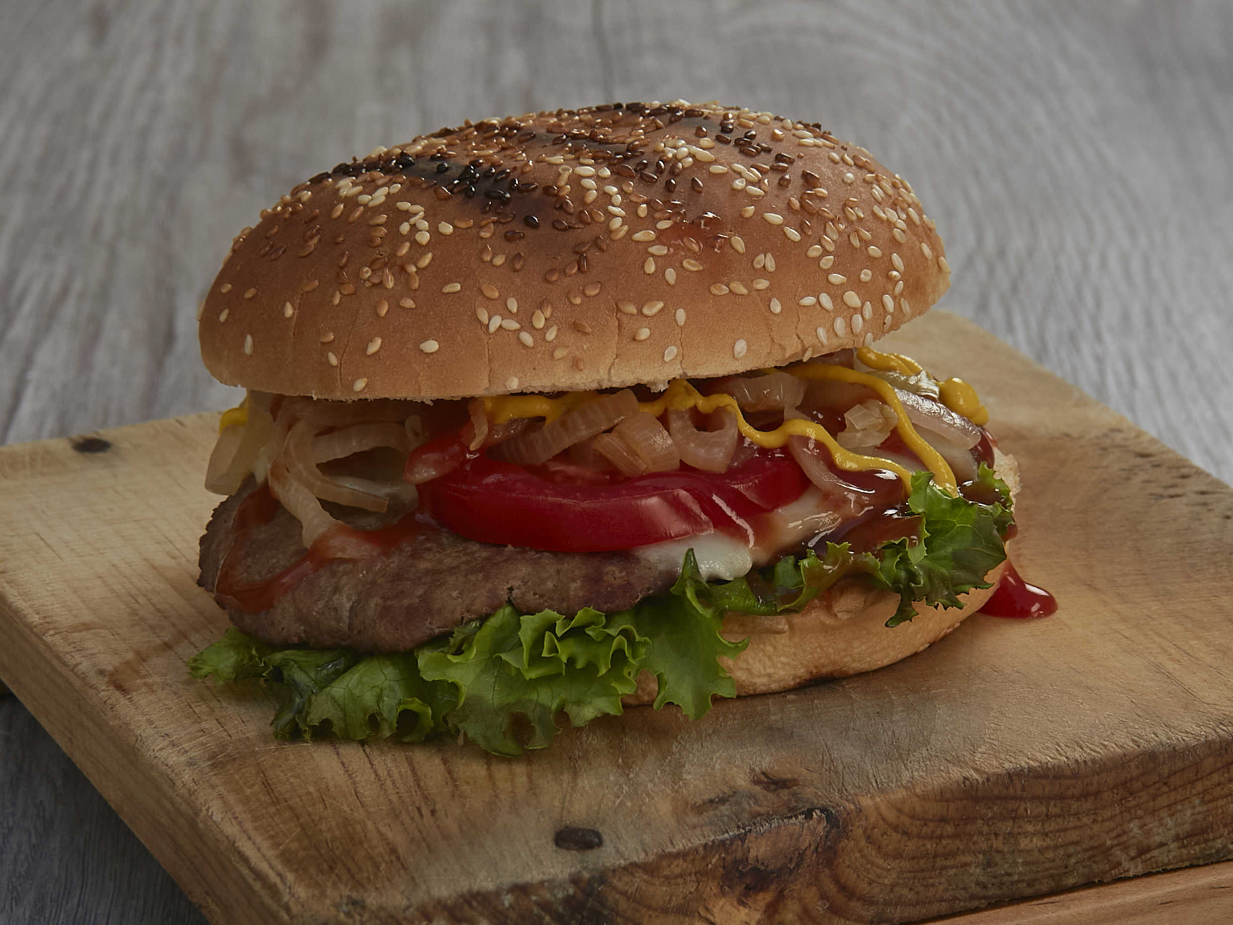 Jugosa carne 100% de res (receta de la casa) gratinada con queso gouda. Todas nuestras hamburguesas son al carbón y preparadas con bimbollo Jumbo, lechuga italiana, jitomate, cebolla caramelizada, rajas, mayonesa, catsup y mostaza.