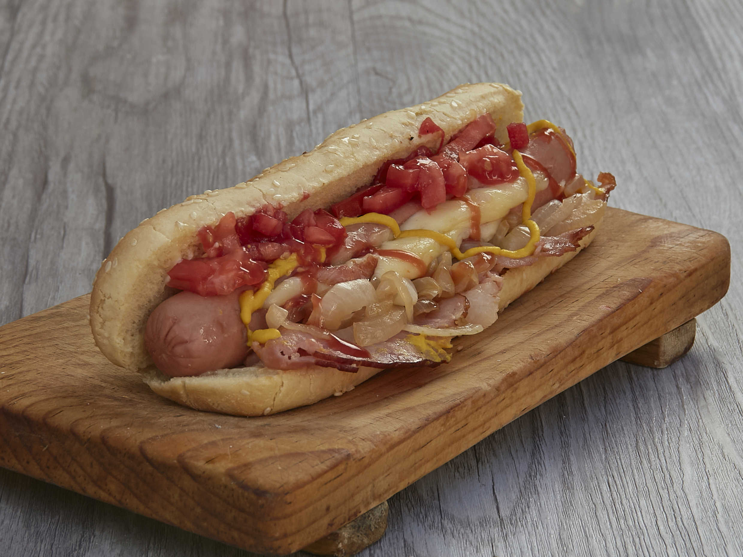 Salchicha de 20 cm, asada al carbon, queso gouda y tocino. Pan con ajonjoli, mayonesa, cebolla caramelizada, jitomate, rajas, mostaza y catsup