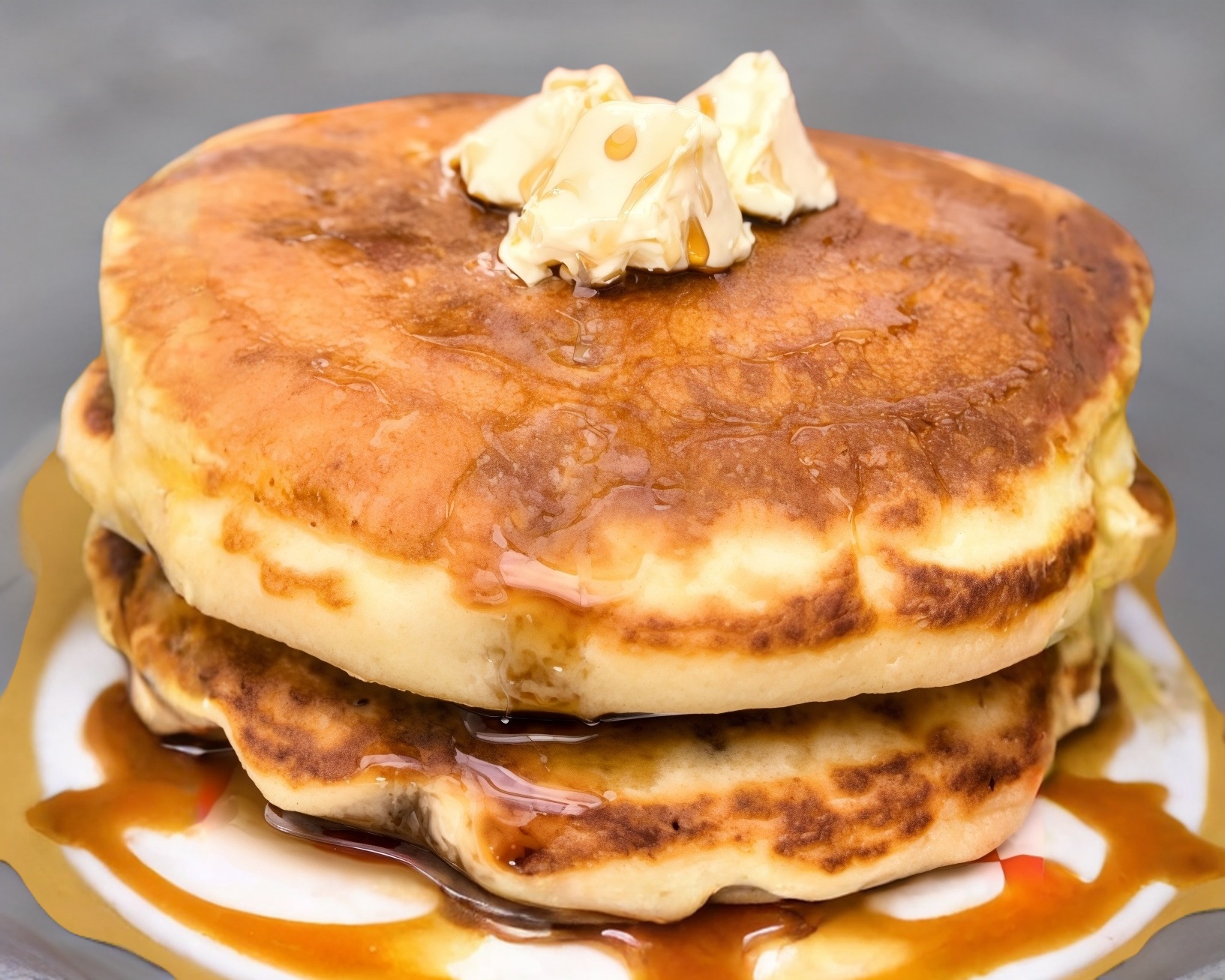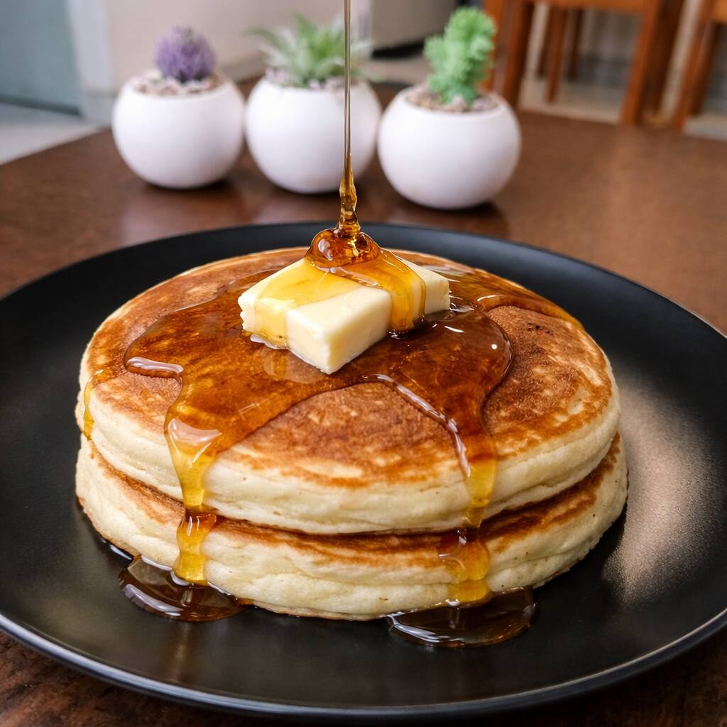 2 piezas de hot cakes con mantequilla y miel de maple.