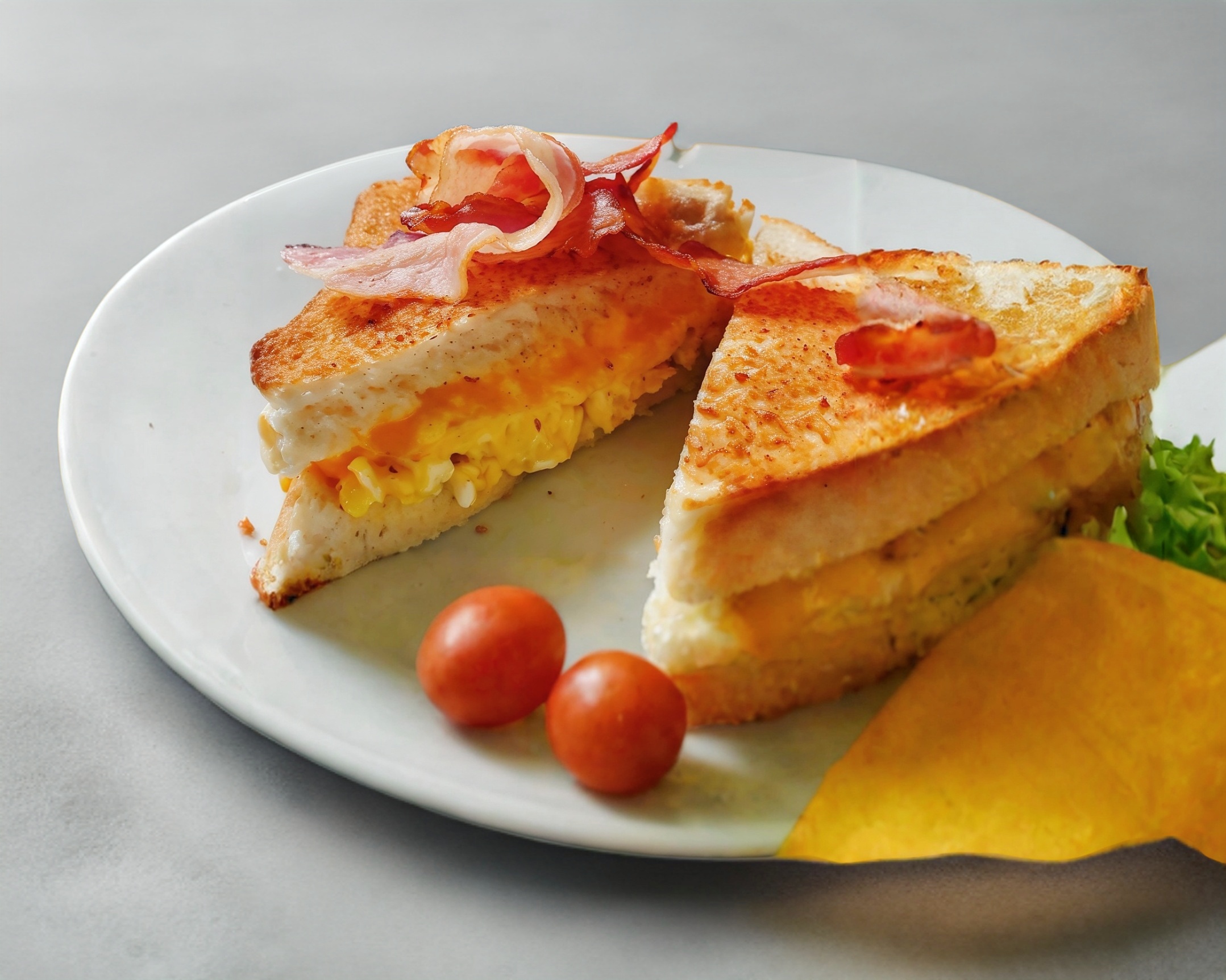 2 huevos revueltos con delicioso queso americano fundido y tocino.