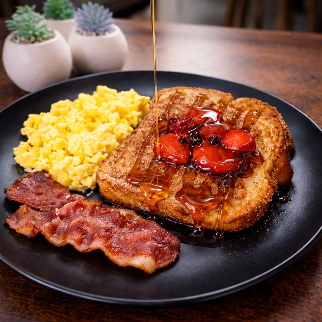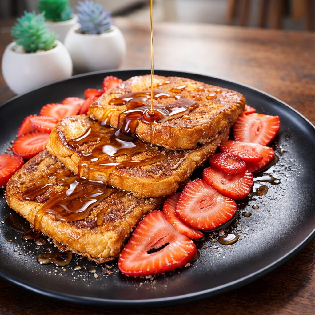 Tres piezas de pan francés con fresa y miel de maple.