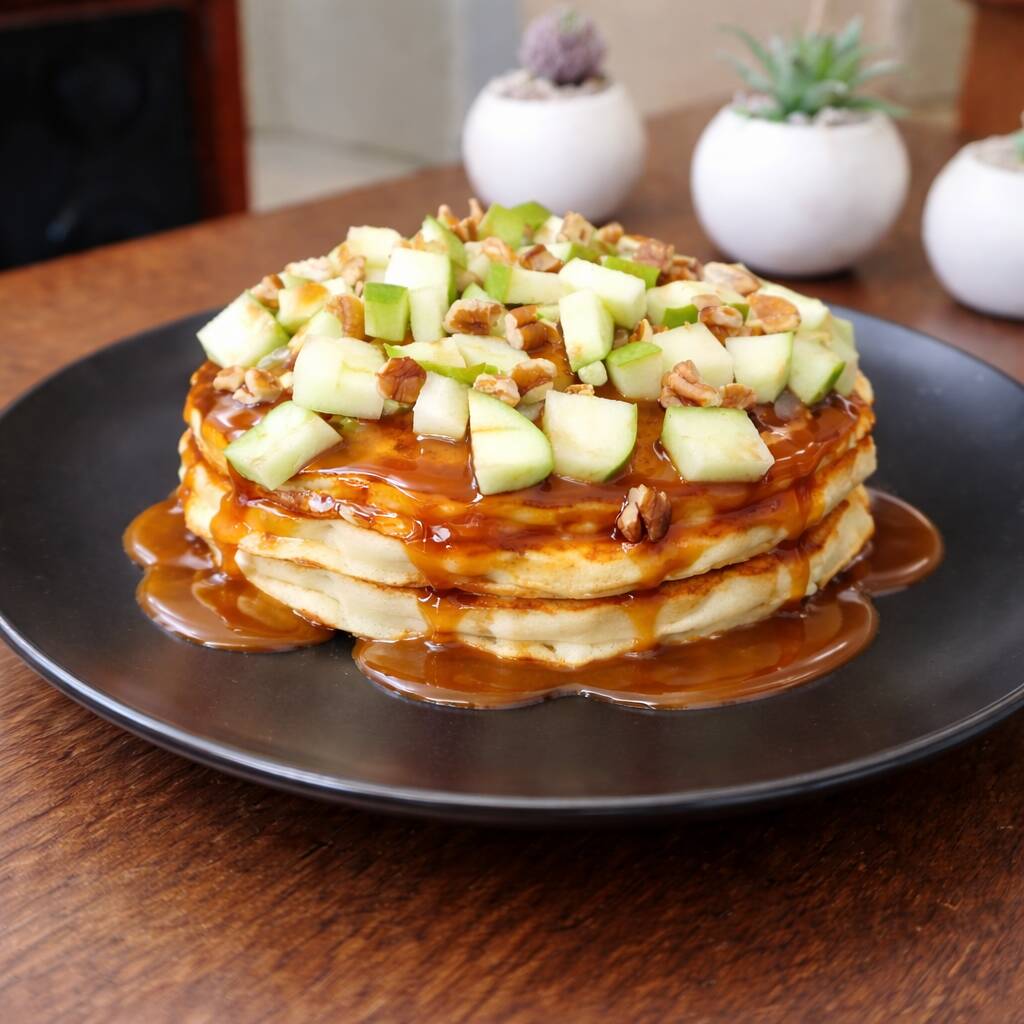 2 hot cakes de avena con plátano acompañado de tu topping y fruta favorita.