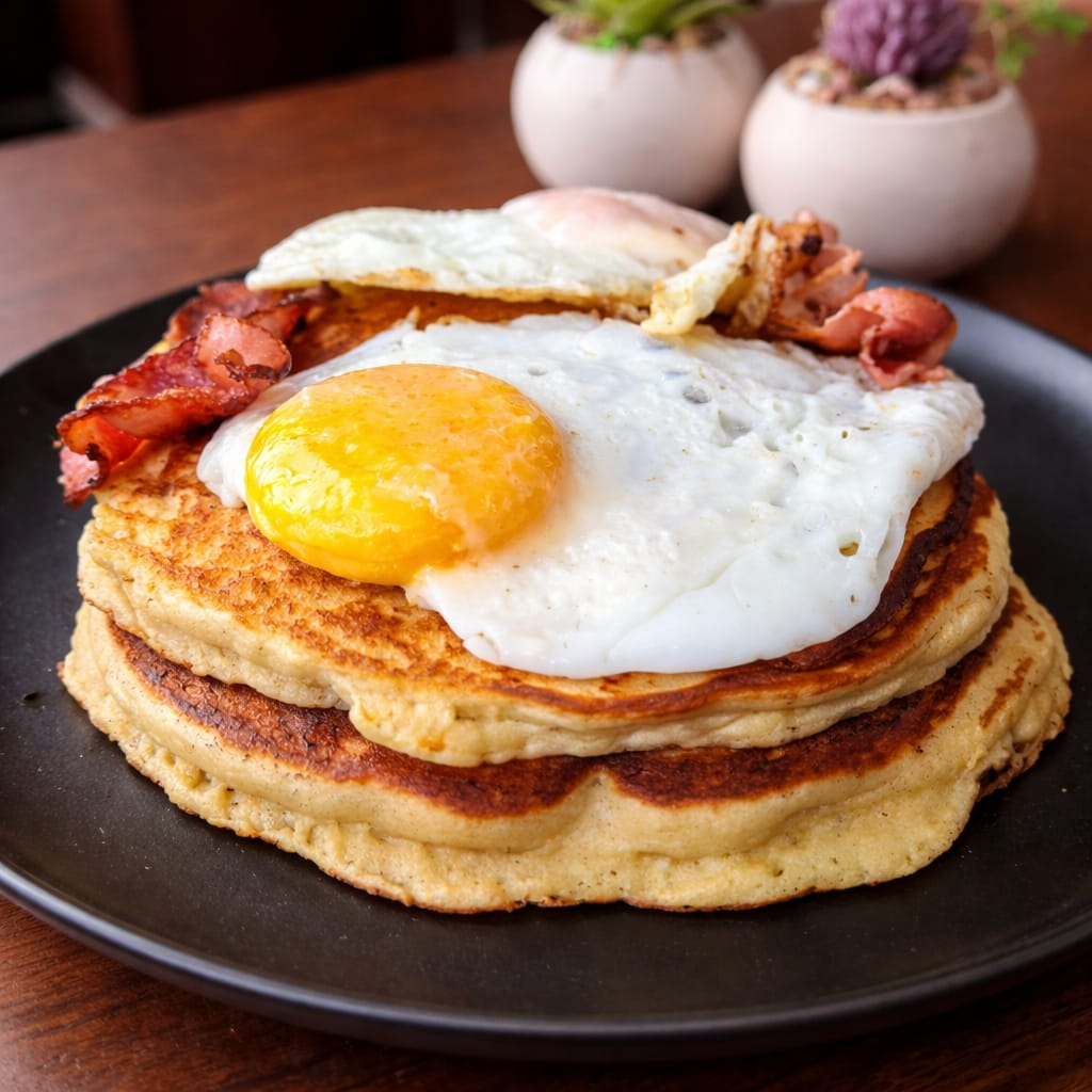 2 piezas de hot cakes con dos huevos estrellados y tocino crujiente.