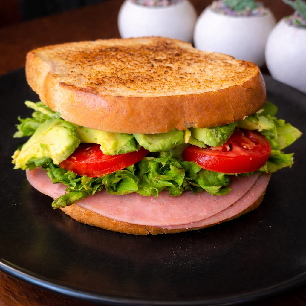 Jamón de pavo, queso mozarela, lechuga, jitomate y aguacate.