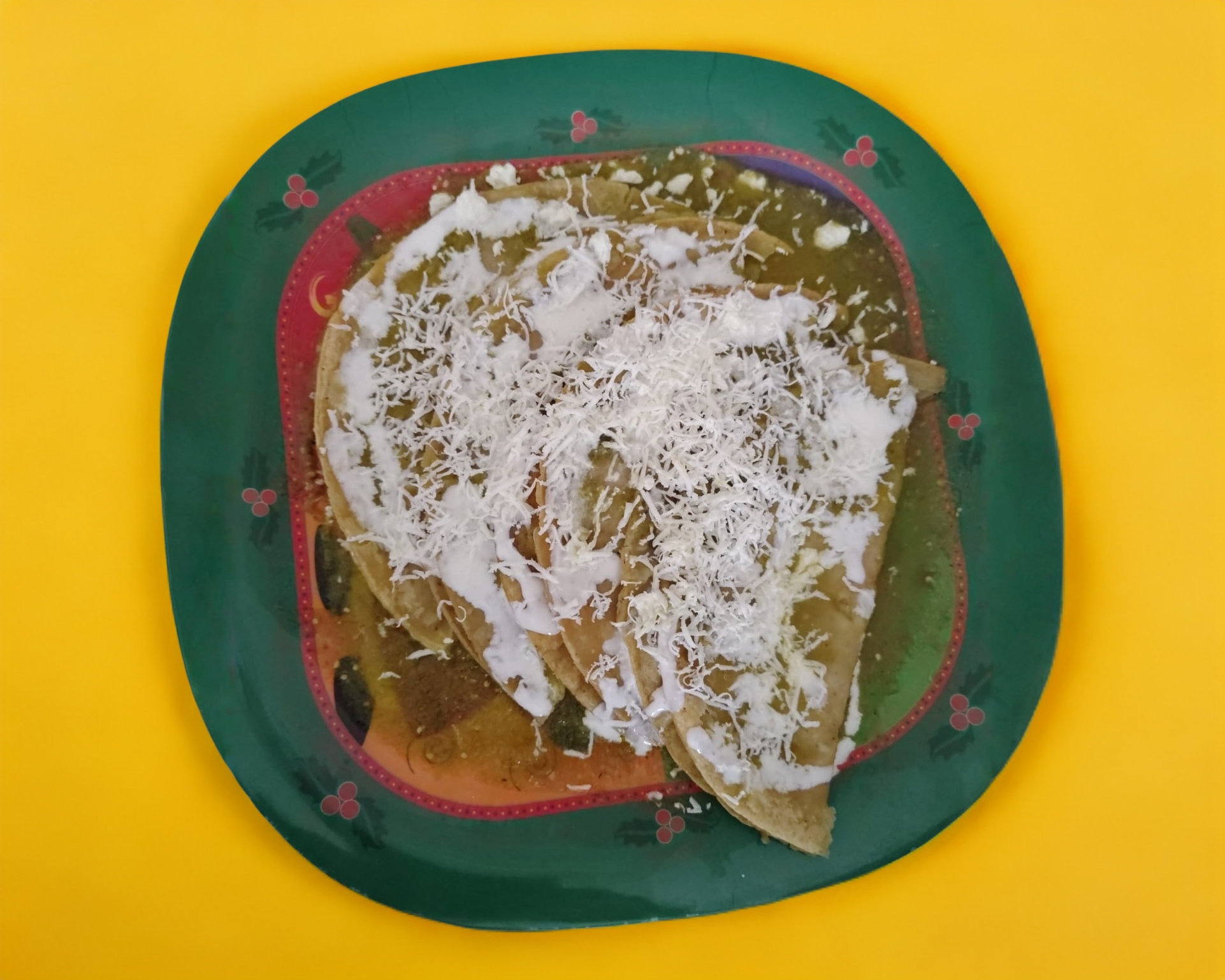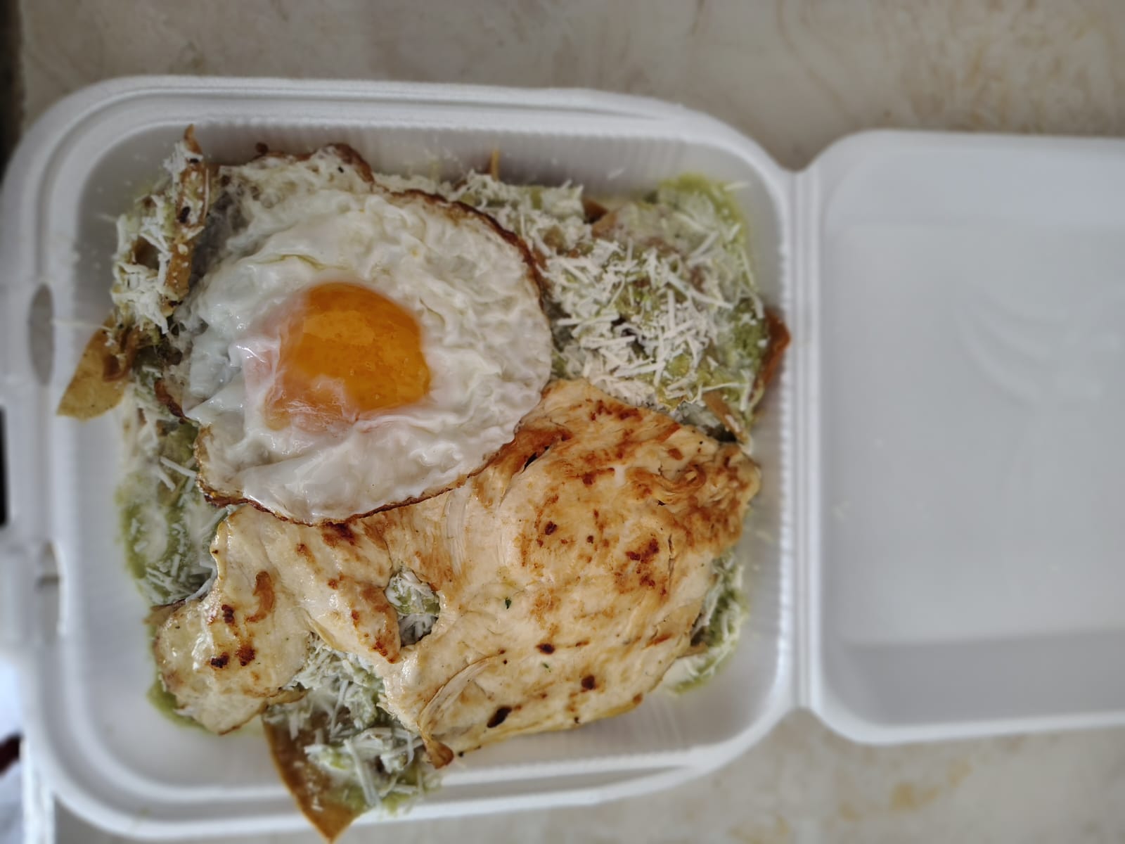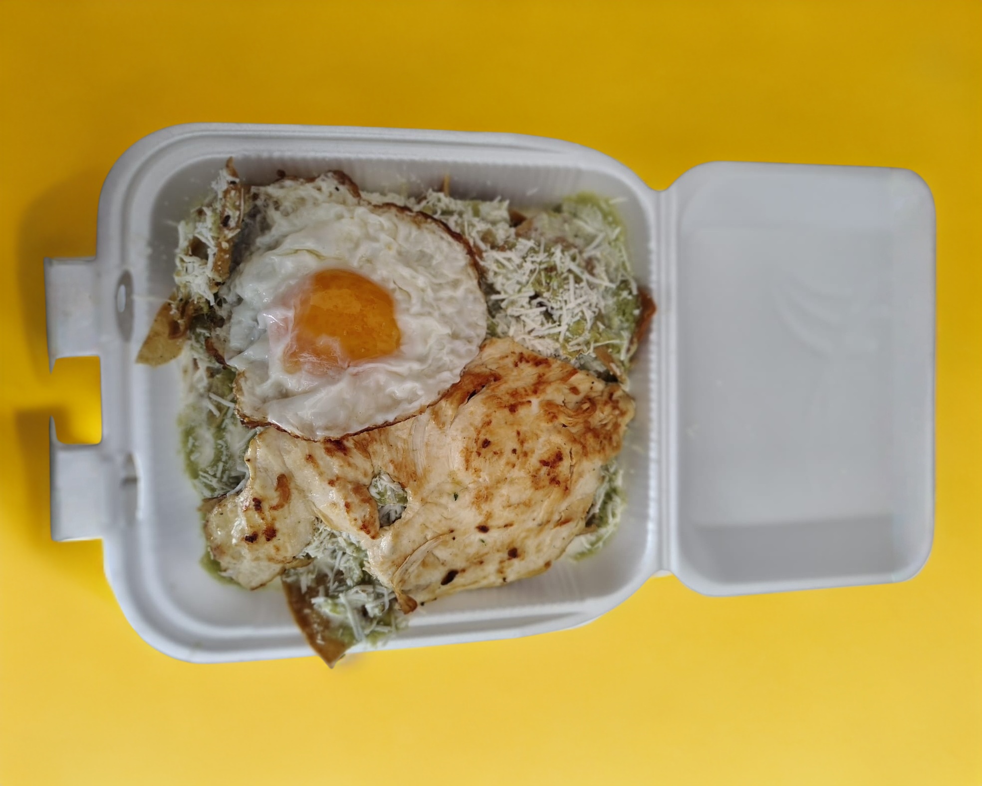 Totopos de maíz fritos bañados en salsa verde o roja, acompañados de cebolla, queso, crema y a elegir pollo o huevo.