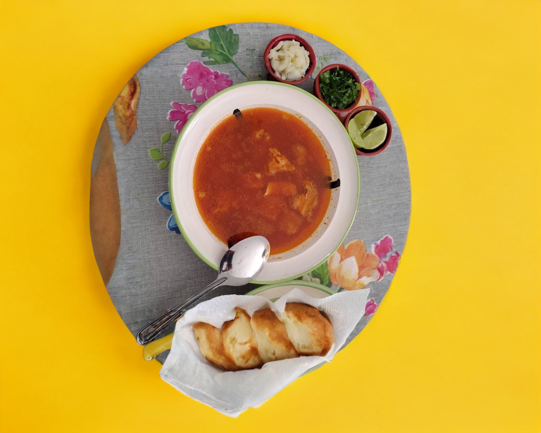 Deliciosa sopa de tornillo con queso y salchicha, mas porción de pan