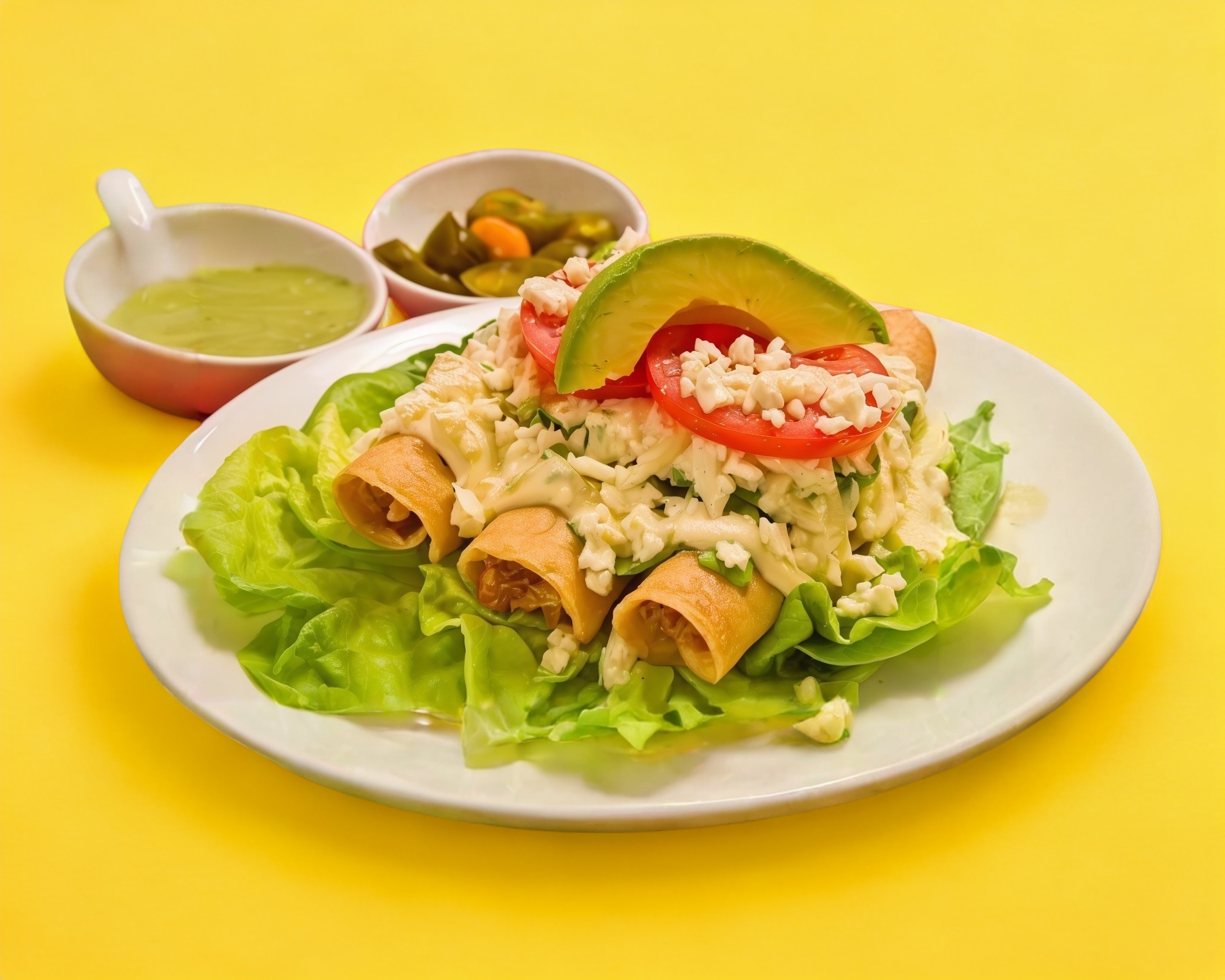 Incluye frijoles refritos y ensalada de lechuga con aderezo ranch.