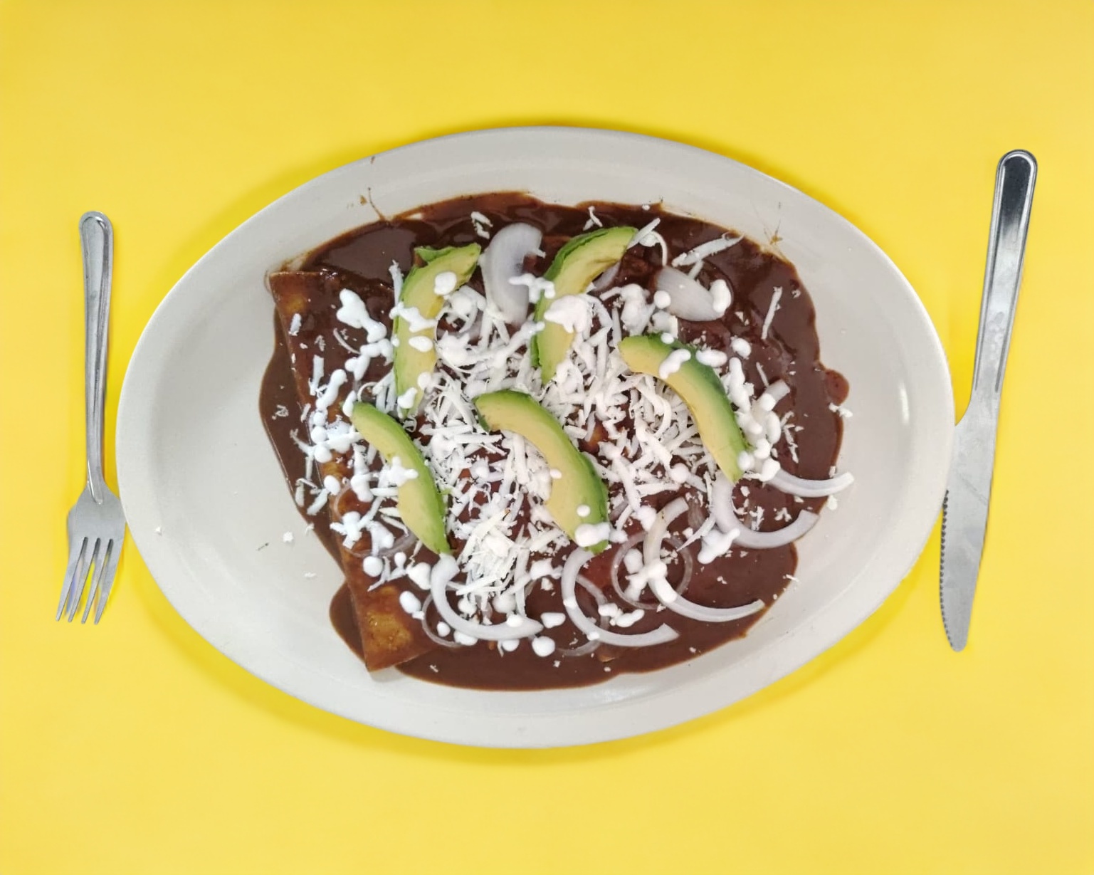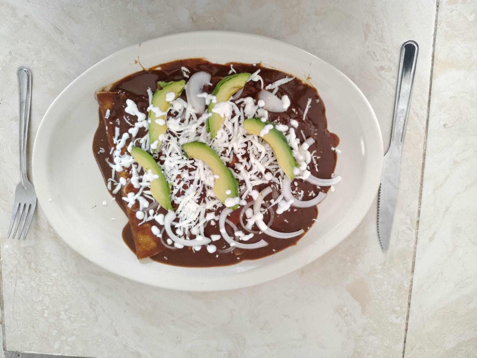 Enmoladas 4 piezas tortillas fritas rellenas de pollo o queso fresco bañadas de mole poblano almendrado cebolla, queso crema y aguacate
