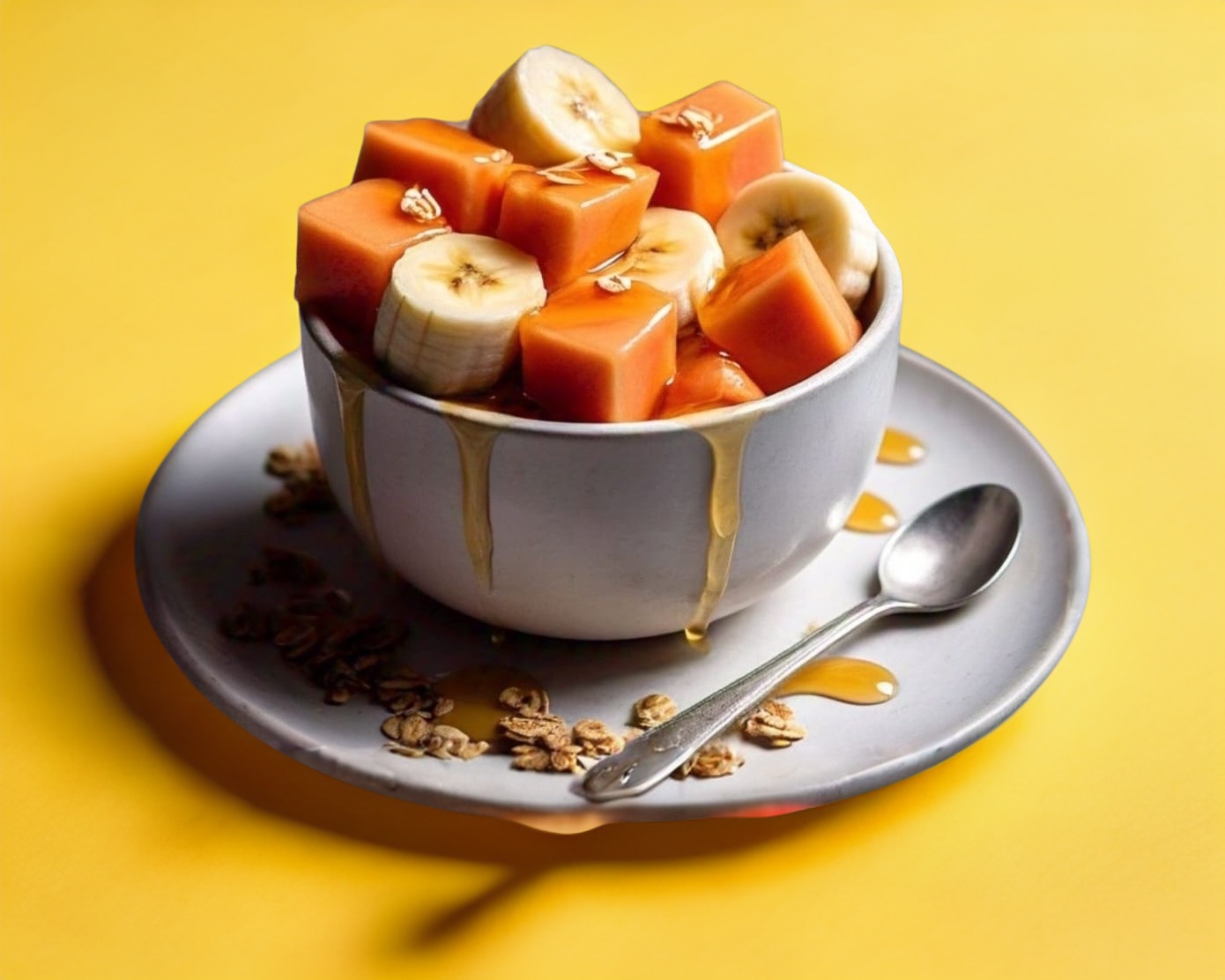 Una selección de frutas frescas de la temporada(manzana, platano, papaya, melón). Se puede acompañar con miel, granola o yogurt (a elección).