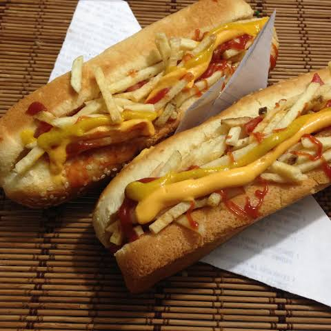 2 Hotdogs de salchicha con tocino, aderezos y cebolla caramelizada