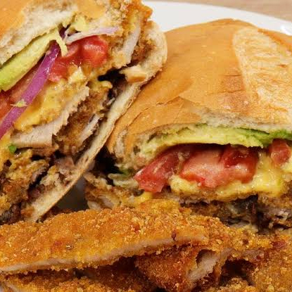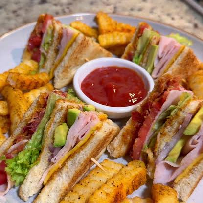 Sandwich de dos pisos, con 3 quesos, pollo, tocino, jamón, lechuga, jitomate, cebolla y aguacate acompañado de papas fritas