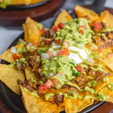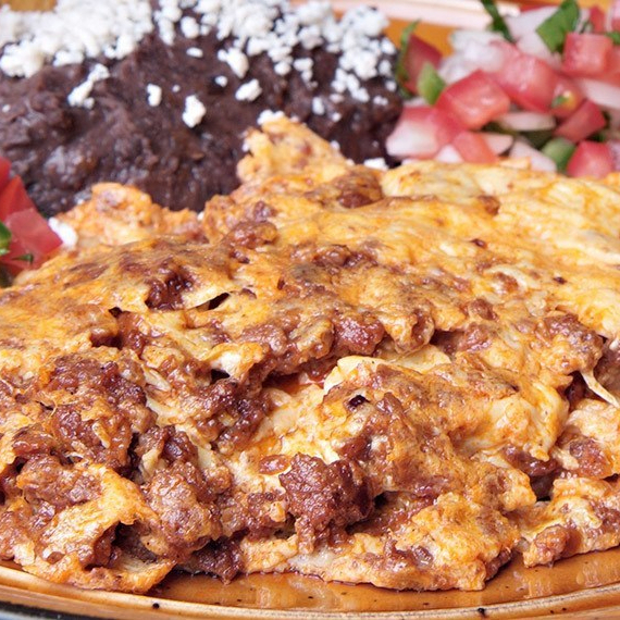 con frijoles, queso amarilo, chorizo, pico de gallo y guacamole