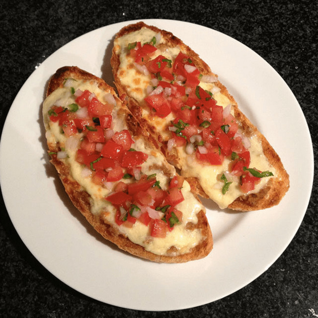 3 piezas de pan para mollete, con frijoles, y queso gratinado, acompañado de pico de gallo