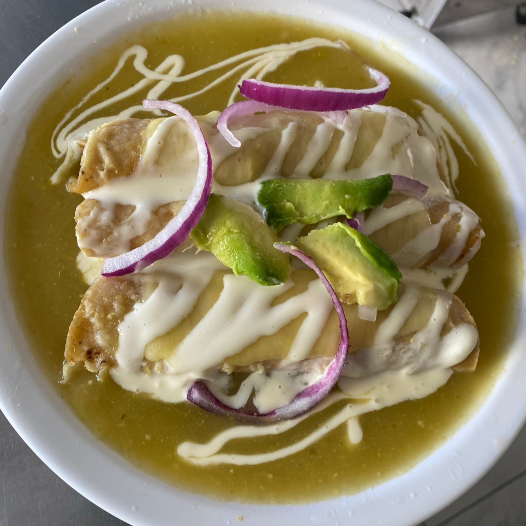 3 Tortillas rellenas de pollo con salsa verde de la casa, queso, crema y cebolla. Incluye café de olla y pan dulce.