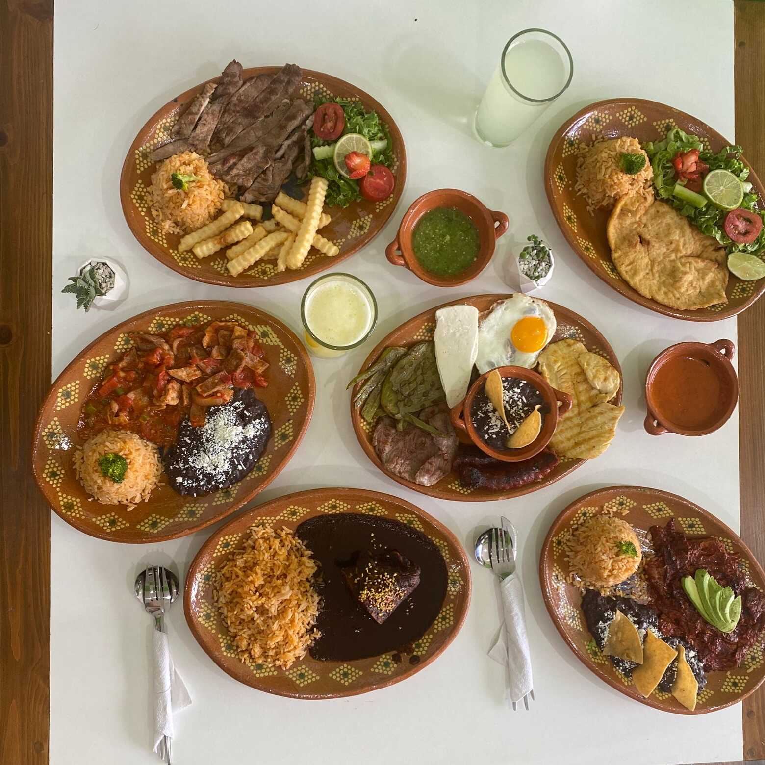 5 Enmoladas, picosas, rellenas de pollo, acompañadas de lechuga, queso, crema y cebolla.