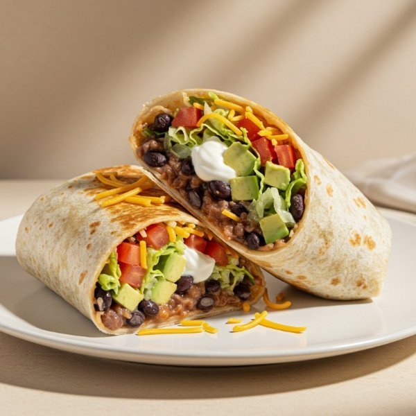 Burrito en tortilla de harina relleno de frijoles negros, queso cheddar derretido, lechuga fresca, jitomate jugoso, aguacate en cubos y crema.