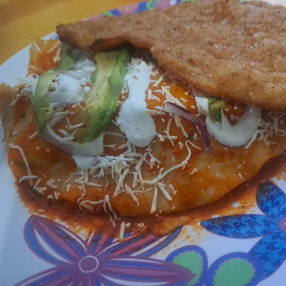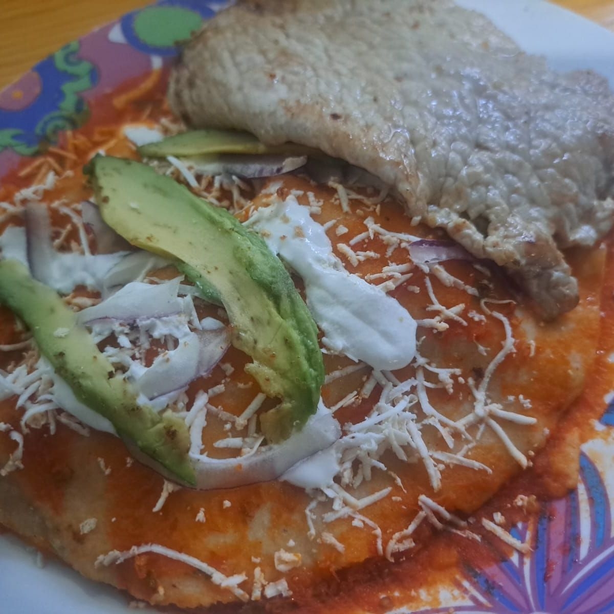 Deliciosas enchiladas rojas acompañadas de milanesa de pollo queso crema cebolla y aguacate