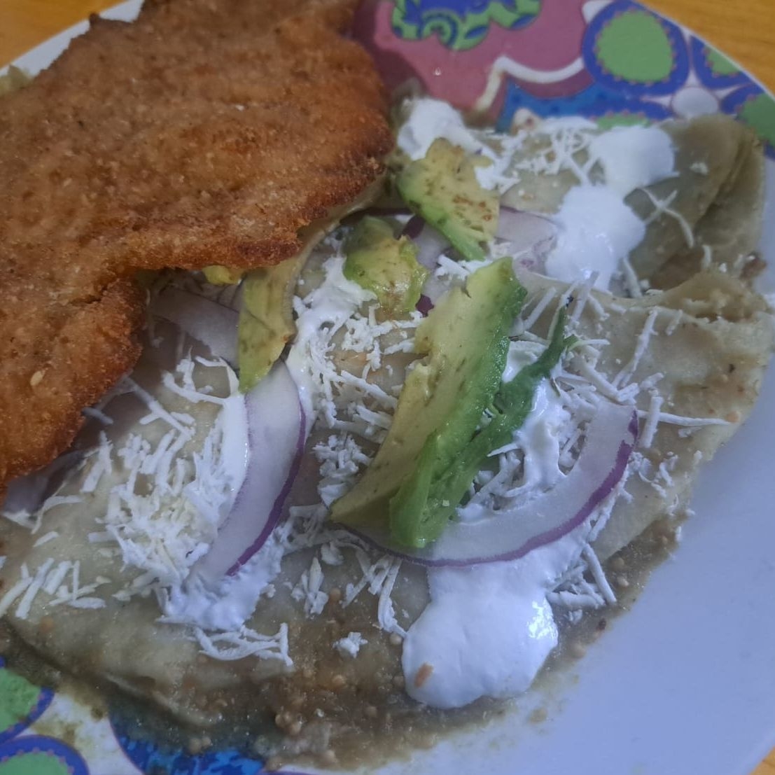 Exquisitas enchiladas verdes con milanesa de pollo acompañadas de queso crema cebolla y aguacate