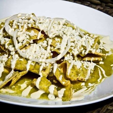 Deliciosos chilaquiles verdes crujientes acompañados de queso crema cebolla y aguacate