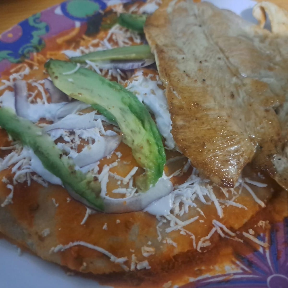 Deliciosas enchiladas rojas acompañadas de pechuga de pollo frita queso crema cebolla y aguacate