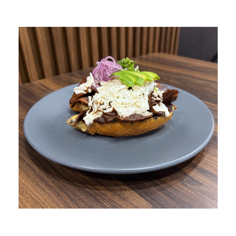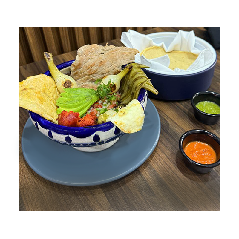 Queso asado 60 g, 1 pza de nopal asado, chorizo 100 g, arrachera 100 g, pechuga asada 100 g, salsa de árbol frita y sazonada.