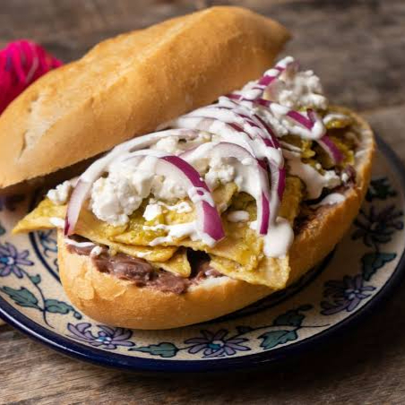 Torta de chilaquiles verdes acompañada de frijoles, queso y crema