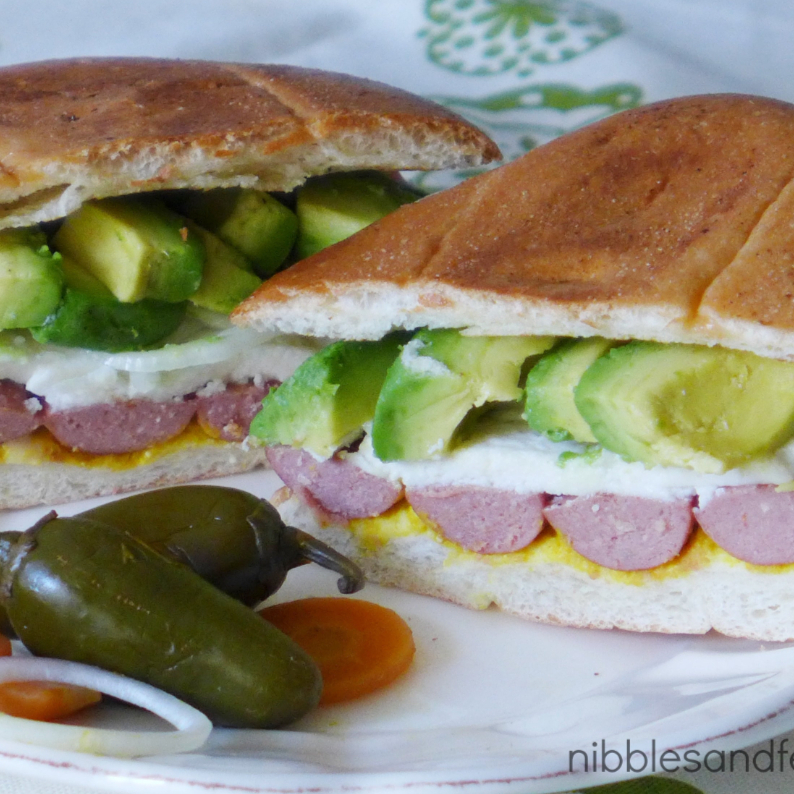 Frijoles, mayonesa, aguacate chiles jalapeños, salchicha y huevo