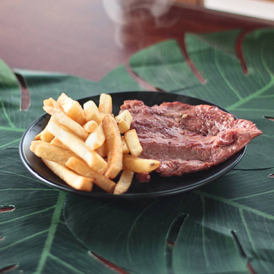 200 Gramos de arrachera marinada, con papas a la francesa (200 gramos) o ensalada sencilla (lechuga, jitomate y cebolla).