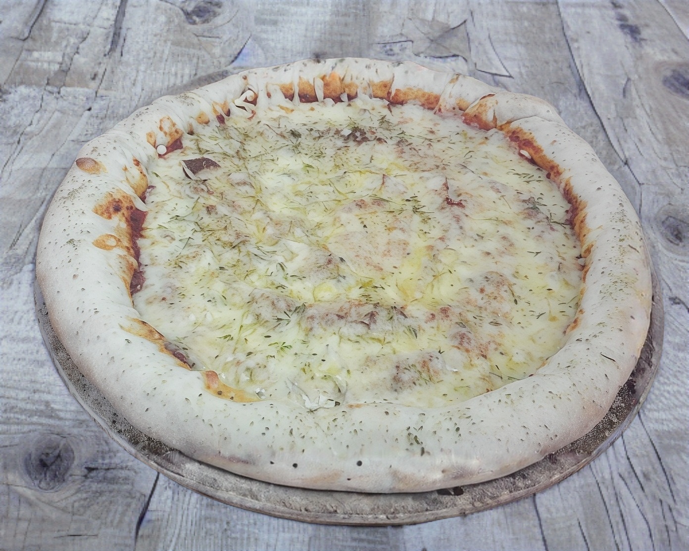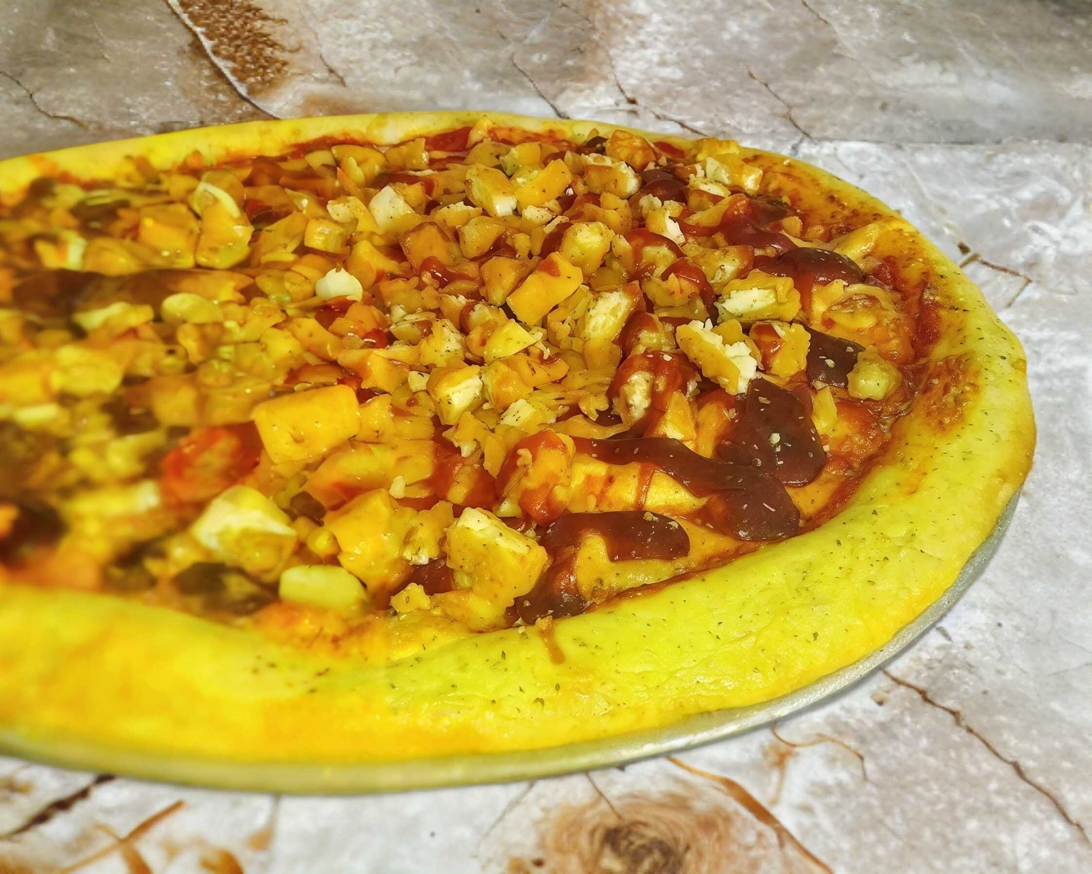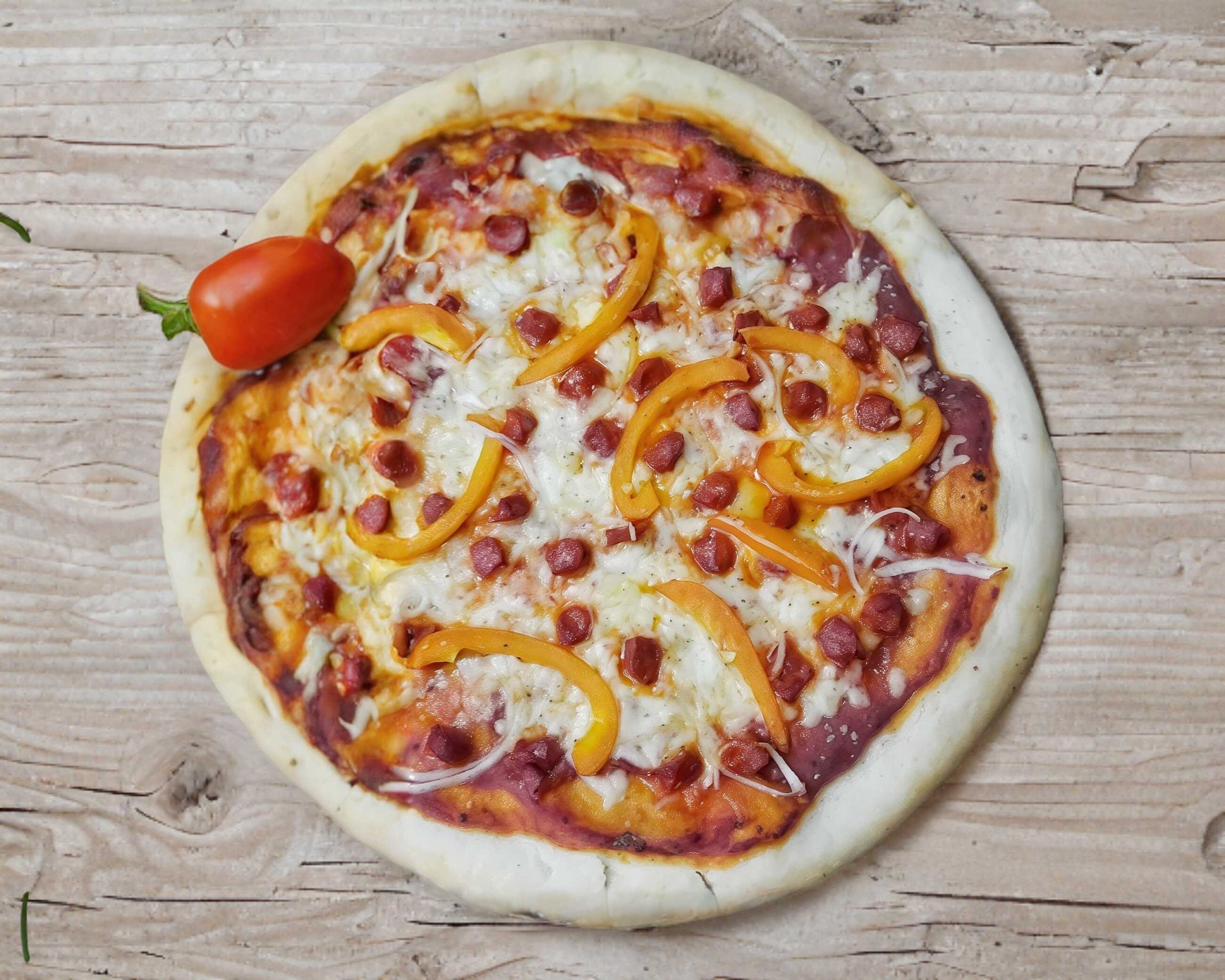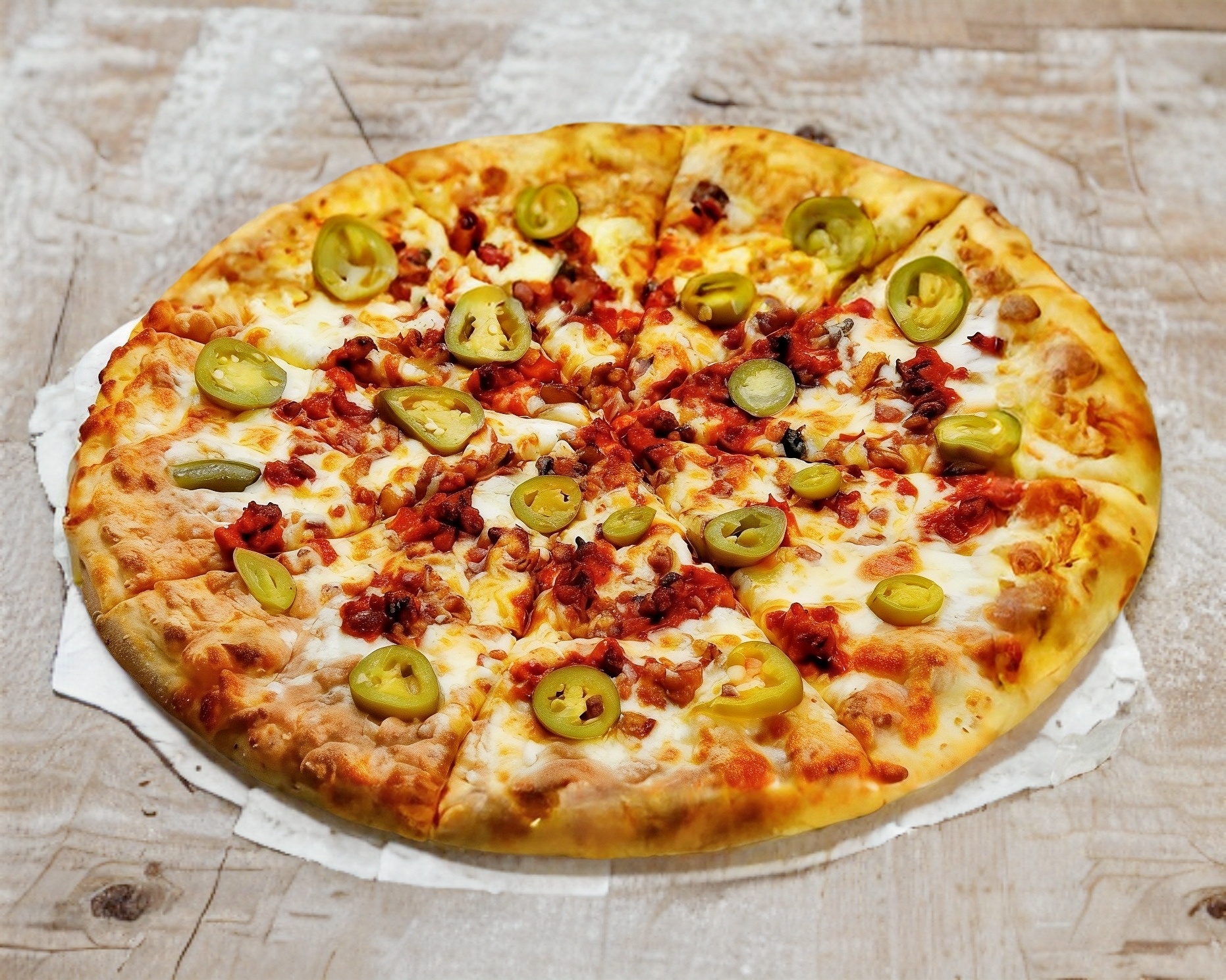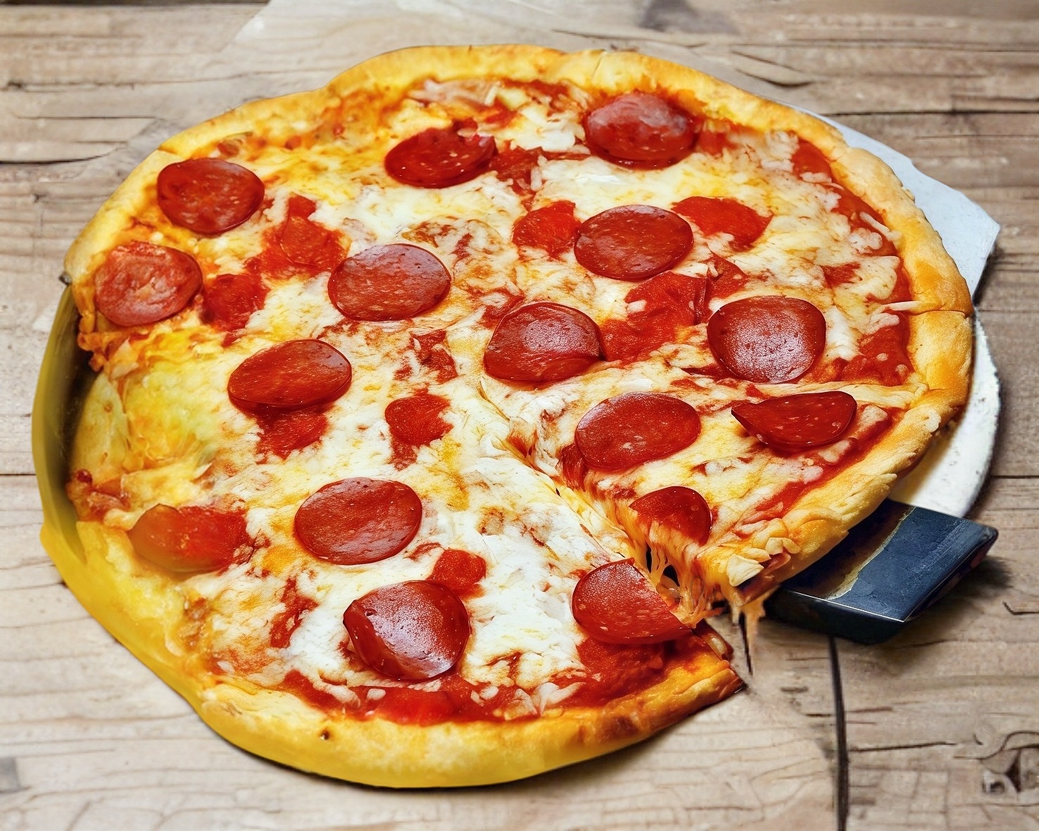 Pizza grande, peperonni, jamón, chorizo y tocino.