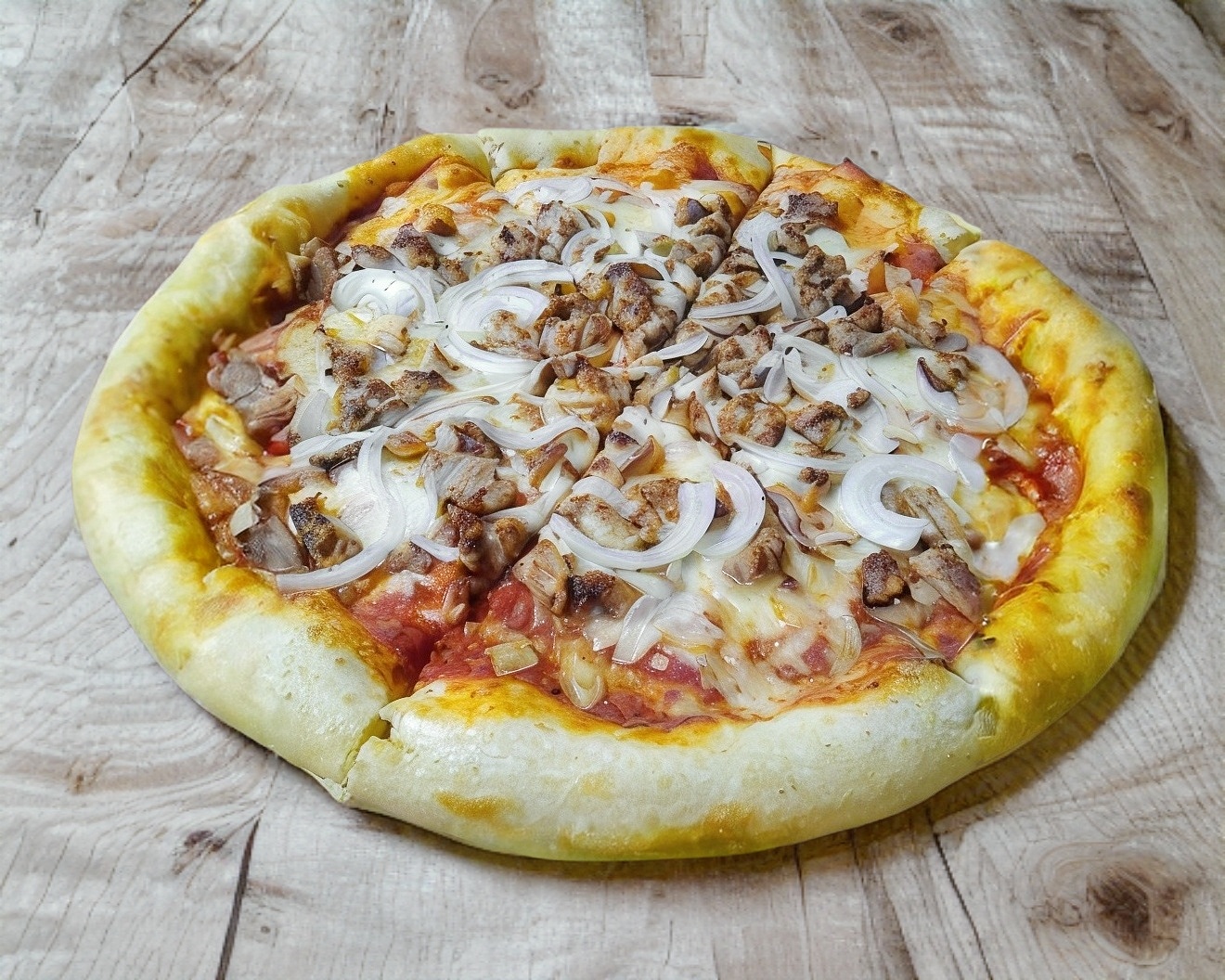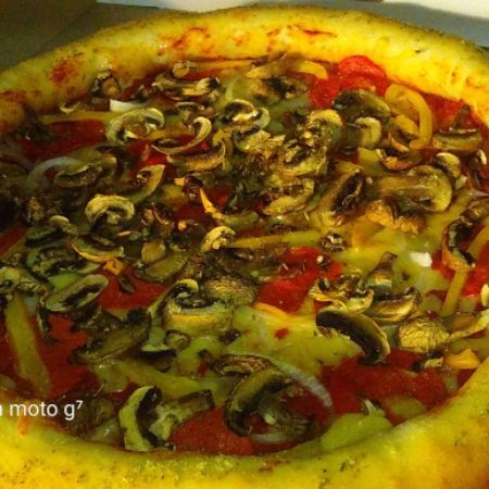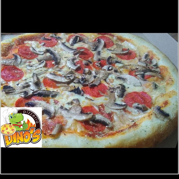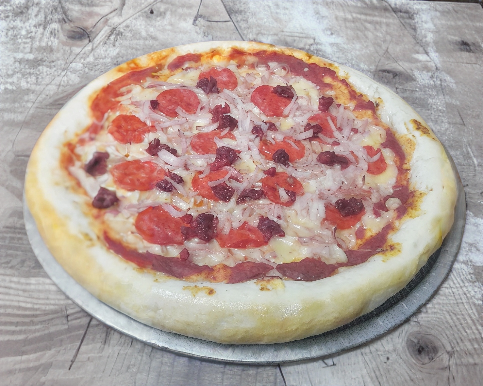 Pizza grande, peperonni, pimiento. champiñón y cebolla.