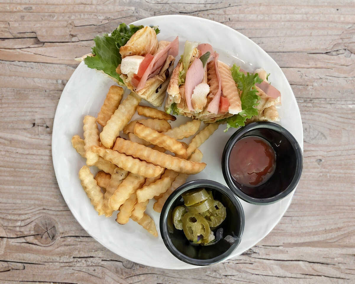 Club sándwich (jamón y pechuga de pollo) y papas a la francesa (200gr)