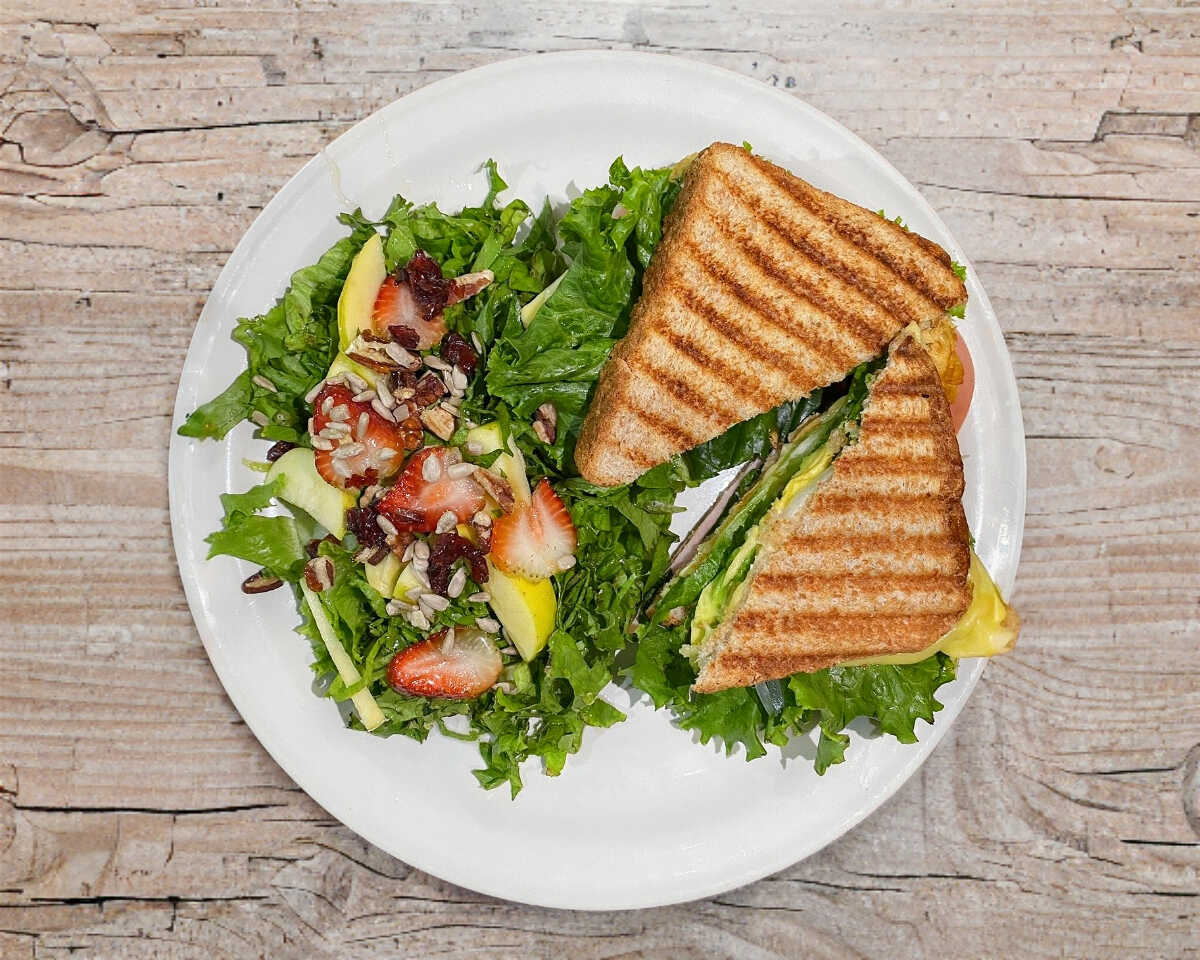 Sándwich de 2 niveles con jamón, pechuga de pollo, queso manchego, aguacate y verduras mas ensalada frutal.