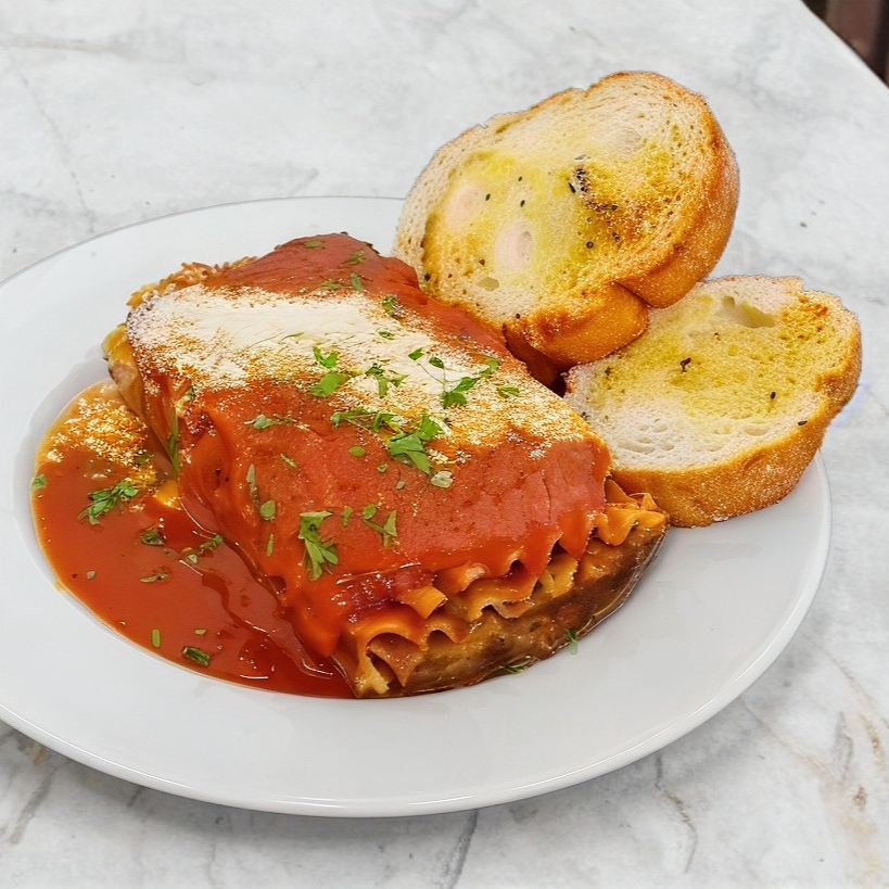 Una obra maestra de la cocina italiana, nuestra lasaña tradicional está hecha con capas perfectamente equilibradas de pasta fresca, una robusta salsa marinara de tomates sazonados con hierbas italianas, carne molida y mezcla cremosa de queso ricotta. Con queso mozzarella fundido y un toque de parmesano.