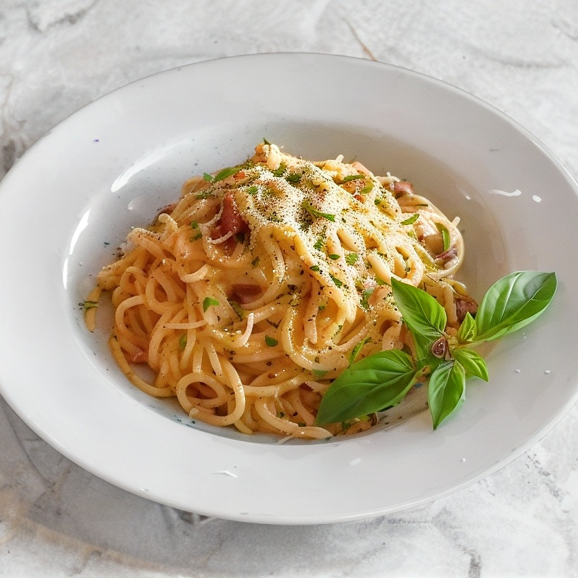 Experimenta la magia de la cocina italiana tradicional. Pasta spaghetti cocida a la perfección, envuelta en una sedosa combinación de huevo fresco y queso parmesano que se fusiona para crear una salsa irresistiblemente cremosa. Realzada con trozos crujientes de panceta dorada y un toque de pimienta negra recién molida.
