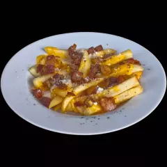 Papas doradas y crujientes, bañadas en una cremosa salsa de queso y rematadas con panceta crujiente. Un toque de sal y pimienta realza su sabor, creando una combinación irresistible.