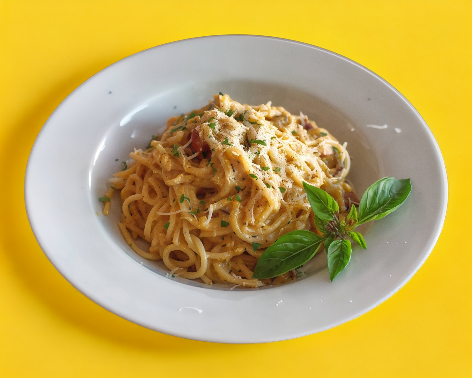 Experimenta la magia de la cocina italiana tradicional. Pasta spaghetti cocida a la perfección, envuelta en una sedosa combinación de huevo fresco y queso parmesano que se fusiona para crear una salsa irresistiblemente cremosa. Realzada con trozos crujientes de panceta dorada y un toque de pimienta negra recién molida.