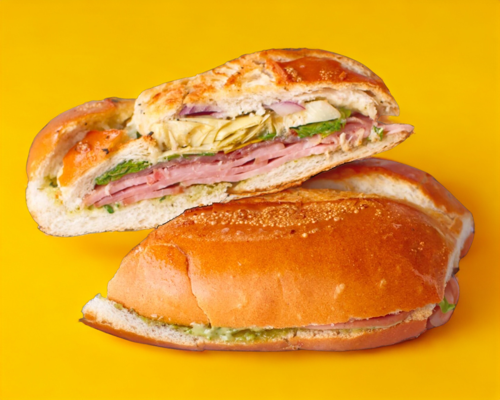 Pan italiano tostado con aderezo pesto, relleno de queso mozzarella, tomate, albahaca, espinaca y jamón prosciutto. Hierbas aromáticas realzan cada bocado. Refinado, fresco y lleno de sabor mediterráneo.