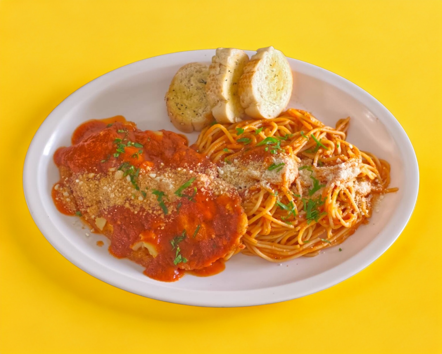 Nuestro Pollo Parmesano se prepara con una jugosa pechuga de pollo, empanizada con una mezcla crujiente de pan molido y especias italianas, dorada a la perfección. Bañado en una exquisita salsa de tomate y cubierta con una generosa capa de queso mozzarella. Servido sobre una capa de pasta bañada en nuestra rica y aromática salsa marinara hecha con tomates frescos, hierbas italianas y un toque de