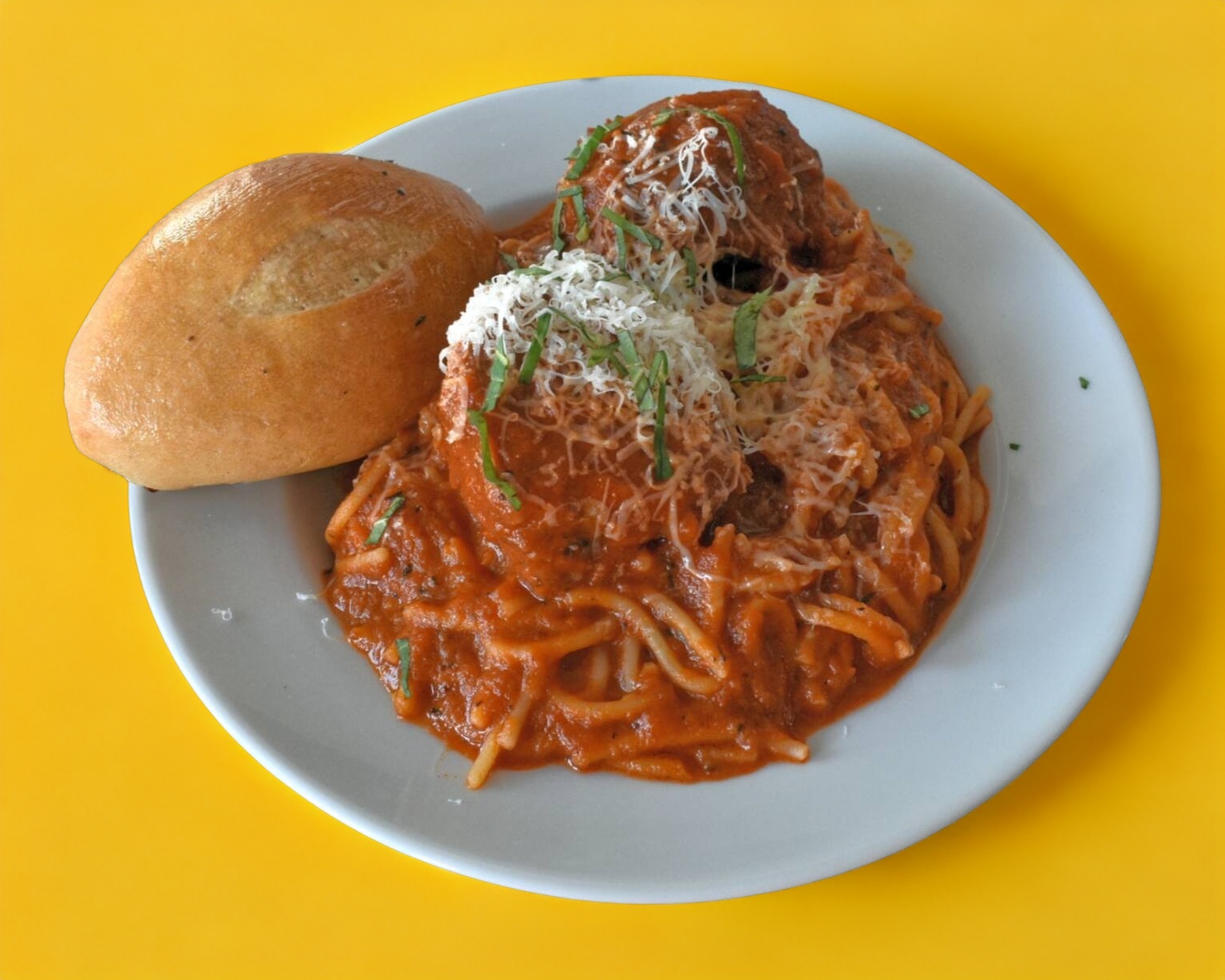 Un clásico que combina lo mejor de Italia en un solo plato. Pasta al dente cubierta con una generosa porción de albóndigas caseras, sazonadas y cocinadas a la perfección. Todo bañado en nuestra rica y aromática salsa marinara hecha con tomates frescos, hierbas italianas y un toque de ajo. Recubierto con queso parmesano rallado y una pizca de albahaca fresca para un toque final.