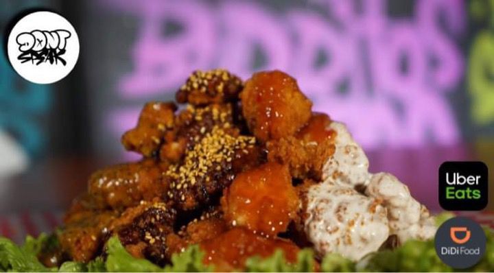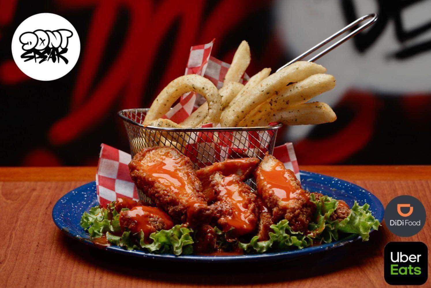Orden de alitas 5 piezas empaniazadas salsa a elegir mango habanero,bbq , bbq hot lemon peper con guarnicion de papas a la francesa 150gr