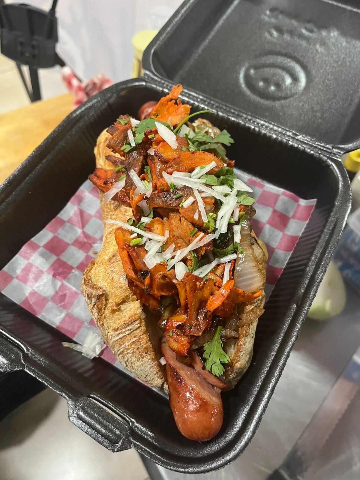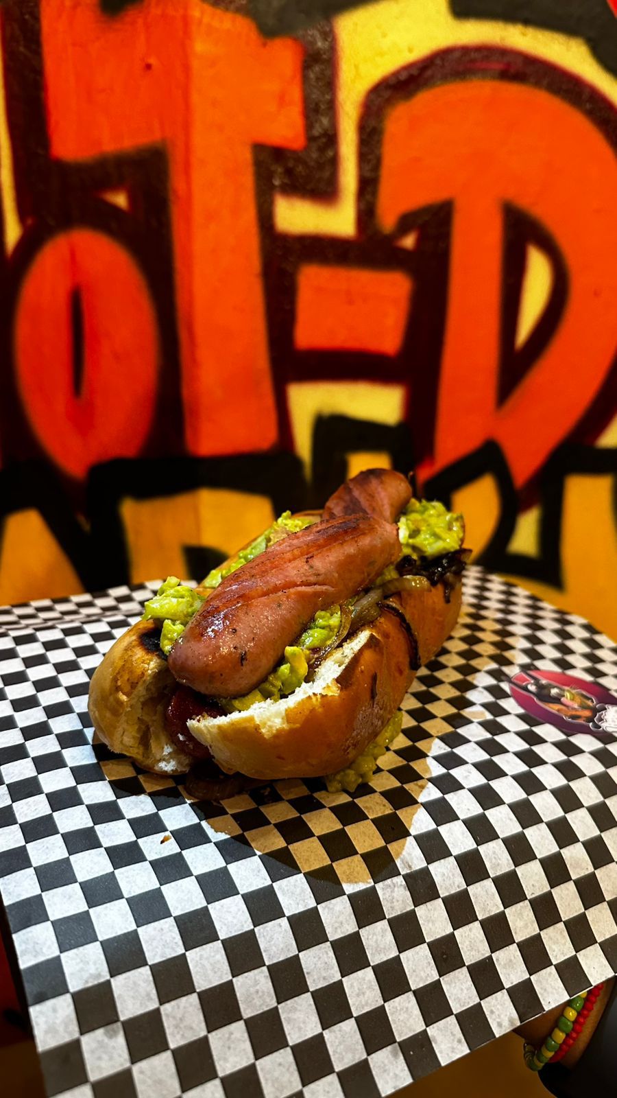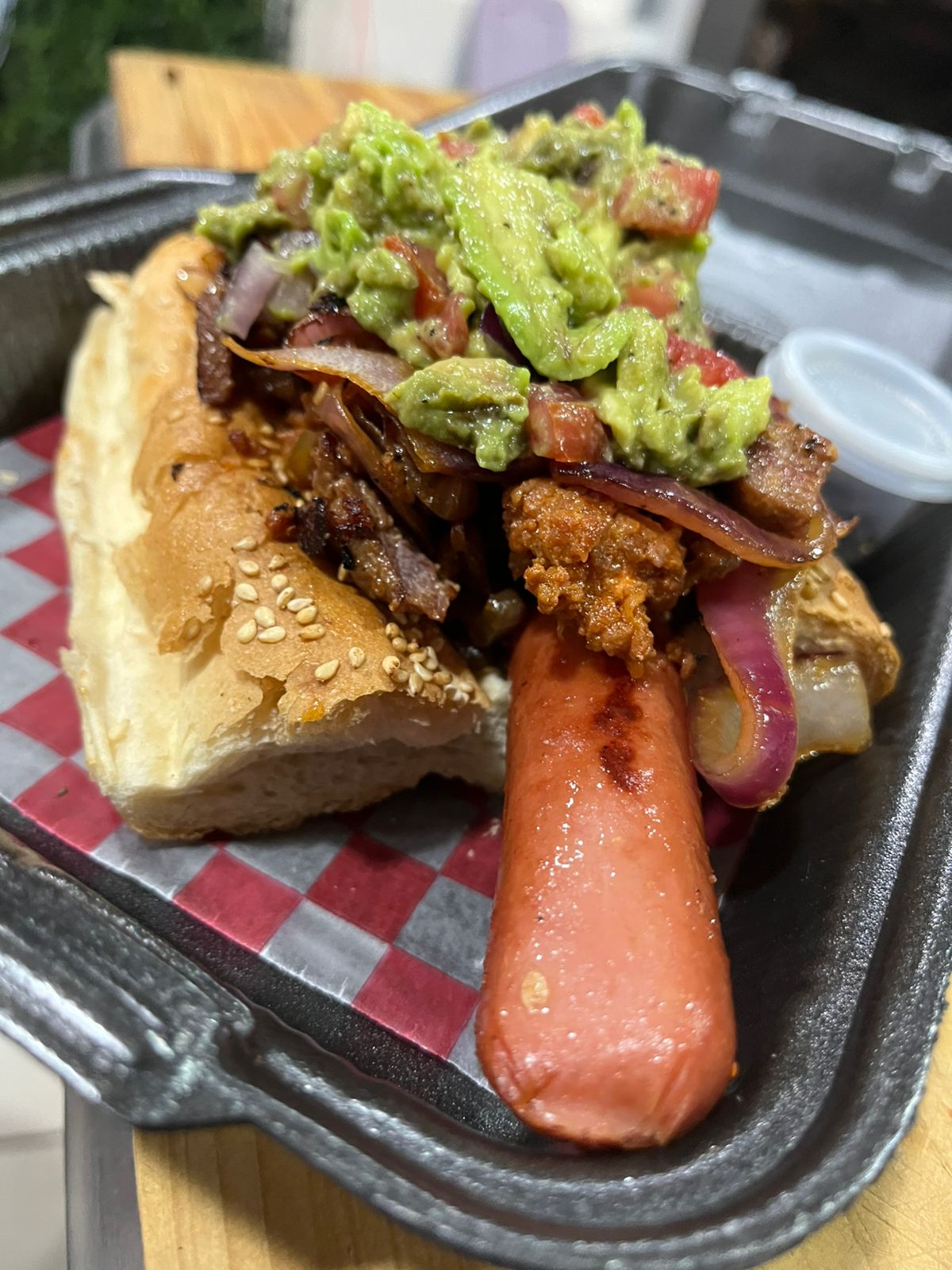 Salchicha, cebolla caramelizada, guacamole y arrachera .