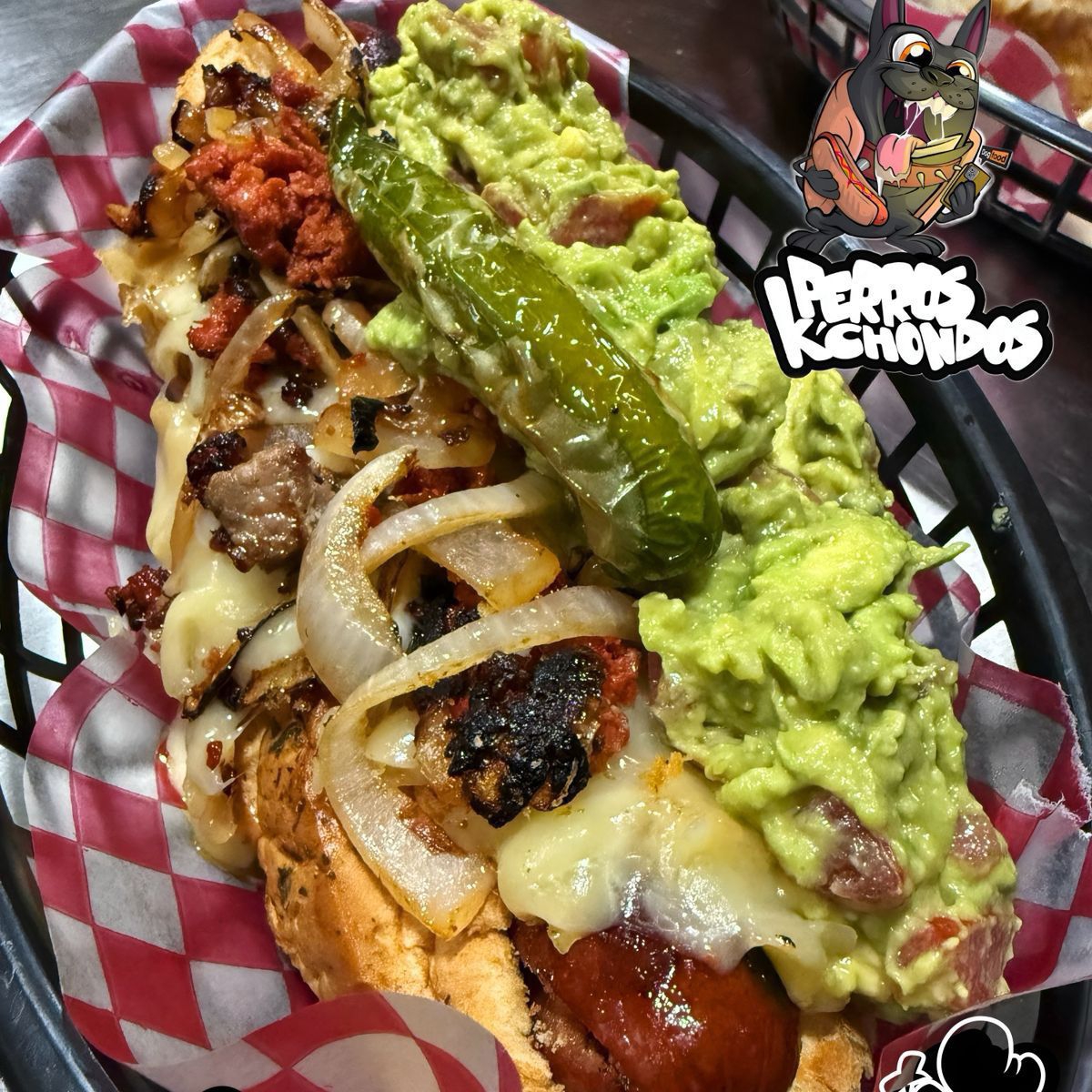 Salchicha, cebolla caramelizada, mix de quesos, guacamole y chorizo argentino.