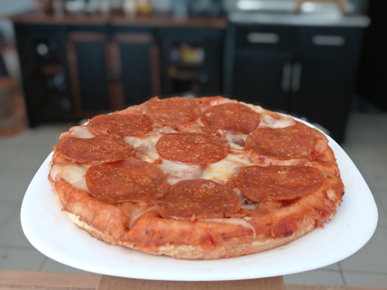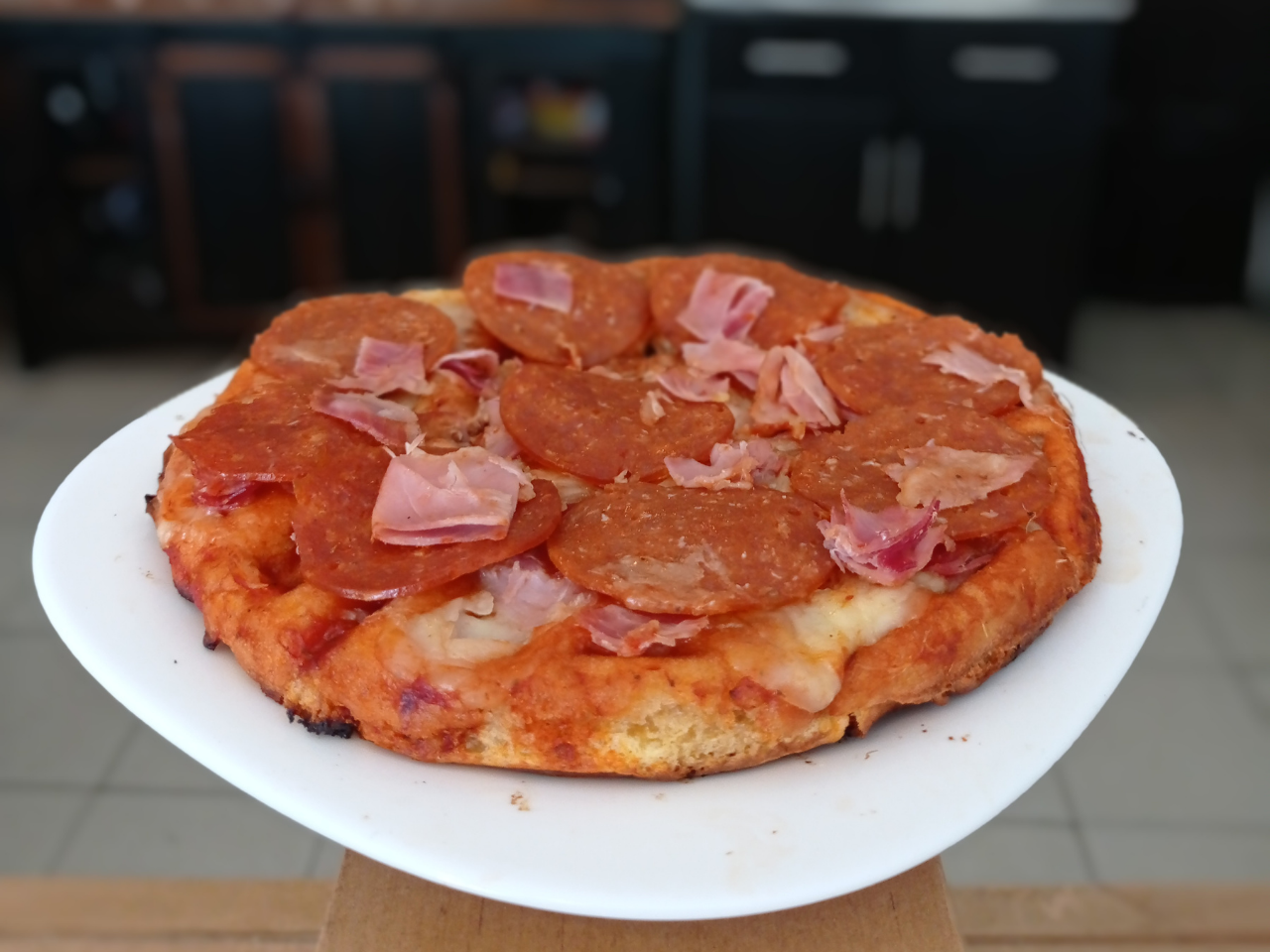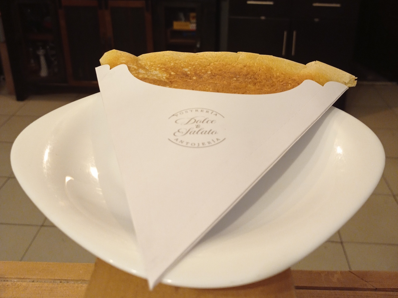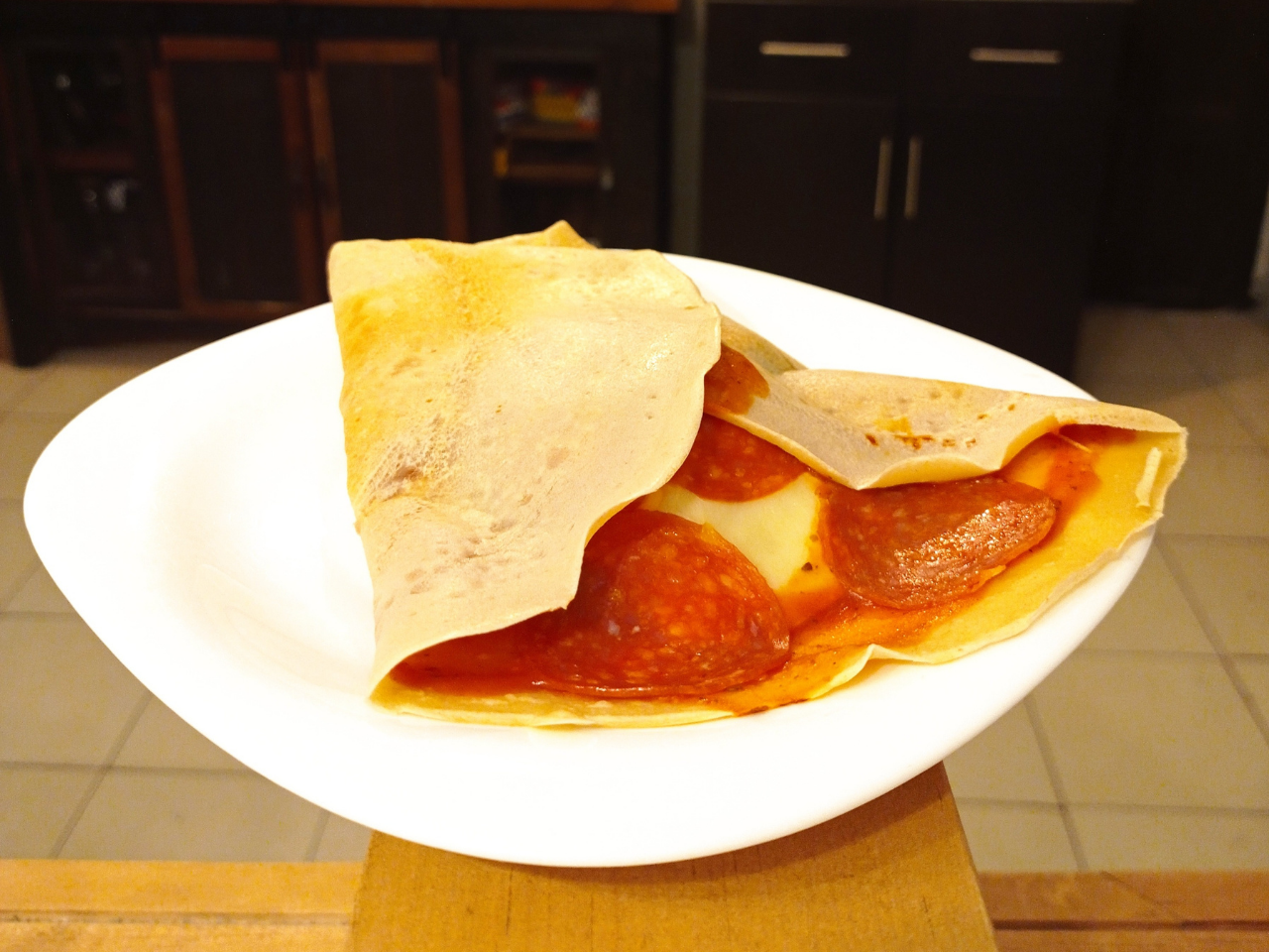 Crepa con salsa de pizzas, jamón, pepperoni y queso manchego.