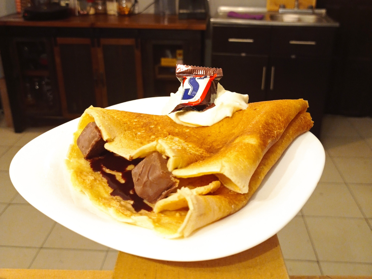 Crepa de crema de avellana, con crema de cacahuate y trocitos de snikers.