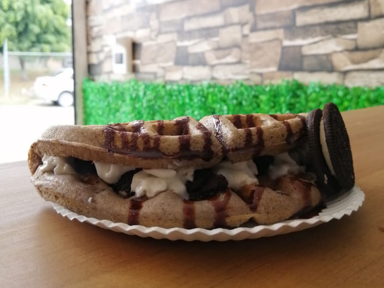 Waffle de Oreo, relleno de queso crema y trocitos de galleta oreo, acompañado con sirope de chocolate.