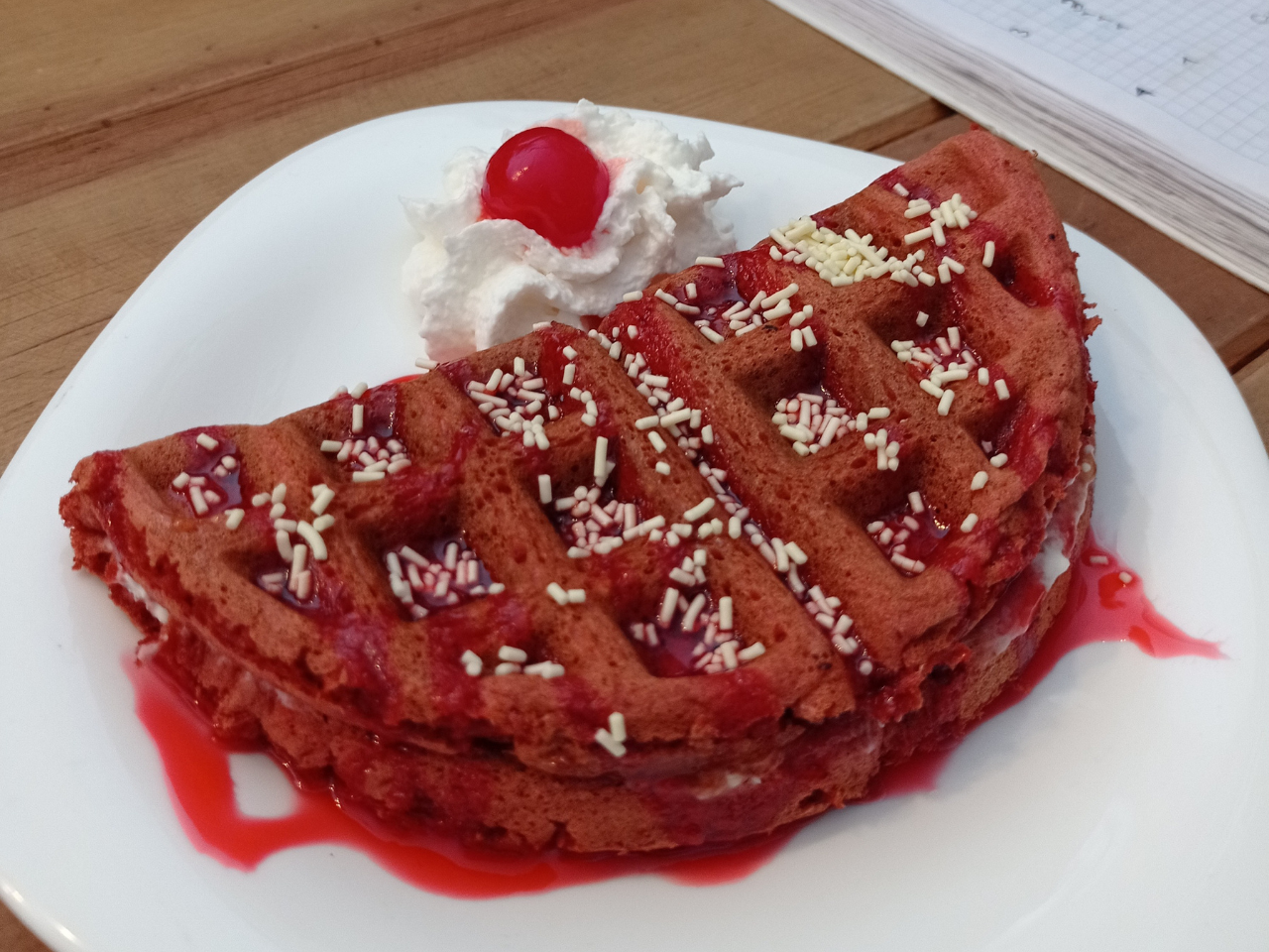 Waffle de chocolate rojo, relleno de leche condensada, sirope de fresa, granillo blanco y queso crema.
