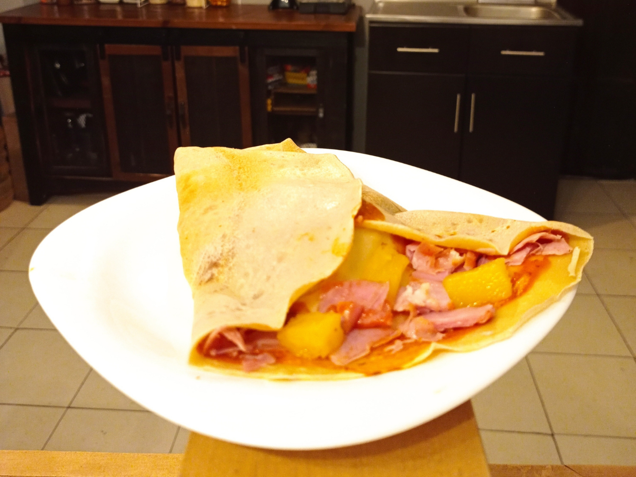 Crepa con salsa de pizza, jamón, queso manchego y piña.